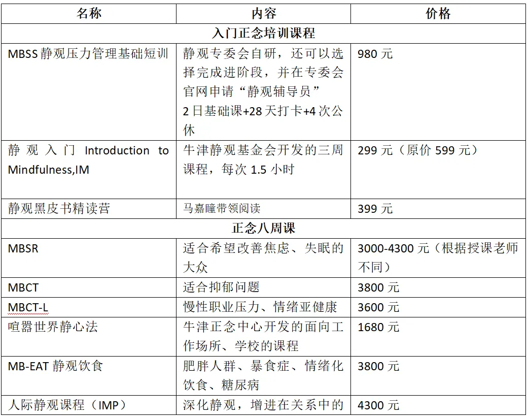 北京“静观Mindfulness”专注于提供受到国外知名大学科研效果支持的专利类正念课程的培训,尤其是由牛津大学正念中心进行研发的正念课程。以与牛津静观基金会合作的MBCT正念师资课程为主轴,辅以面向大众的静观专委会自主研发的MBSS静观压力管理短训练课程。