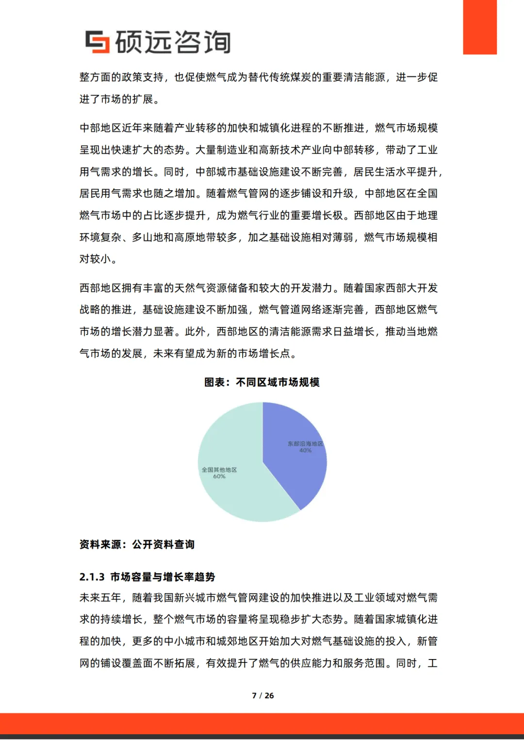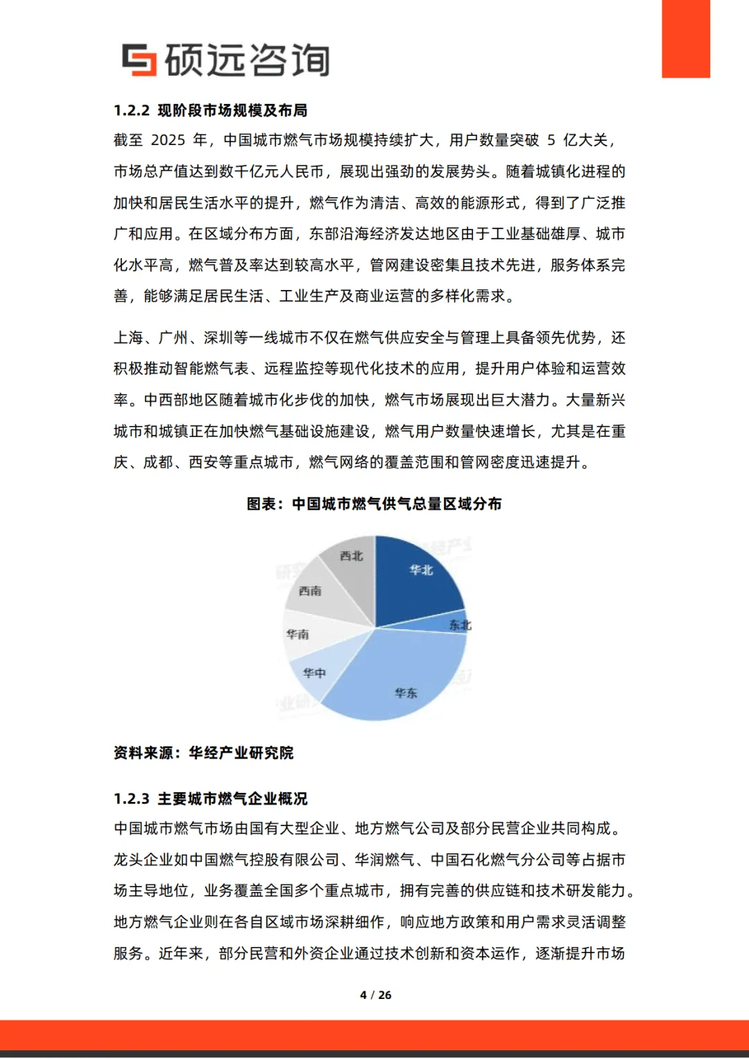 行业层面,城市燃气公共服务以天然气为主流,覆盖居民、商业、工业等多场景,包含燃气生产、输配、终端服务及设备制造四大细分板块。行业历经人工煤气到天然气的转型,截至 2025 年用户突破 5 亿,市场总产值迈向 4000 亿元,近五年年均复合增长率约 8%。区域分布上,东部沿海占全国市场 40%,中西部随城镇化推进潜力凸显,市场由中国燃气、华润燃气等龙头主导,前三大企业市占率超 50%,竞争向综合服务与技术创新转型。