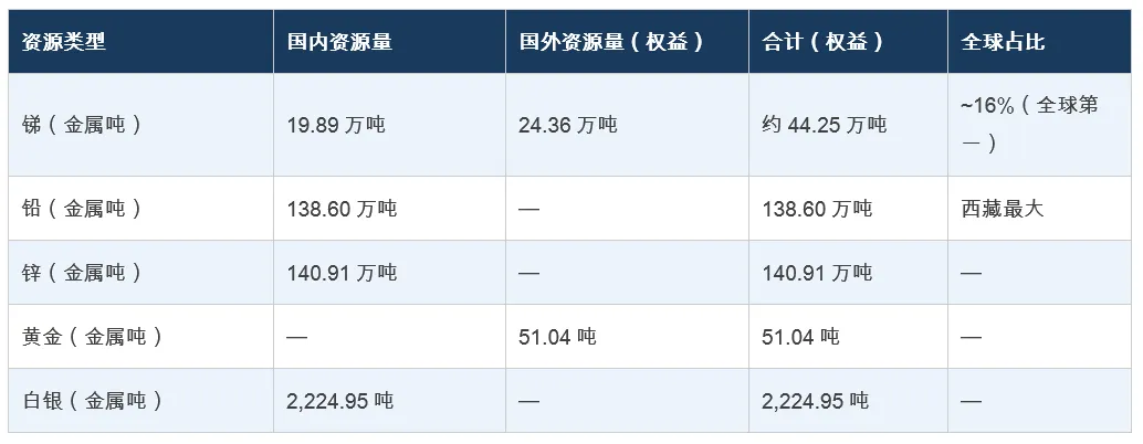 公司目前在产矿山包括西藏扎西康多金属矿、西藏拉屋铜锌矿和塔吉克斯坦康桥奇锑金矿(塔铝金业)三处核心资产,柯月铅多金属矿等多处探矿权处于探转采关键阶段。国内累计控制铅、锌、铜、锑、银等有色金属资源量近300万金属吨,资源量数据已在自然资源部完成评审备案。