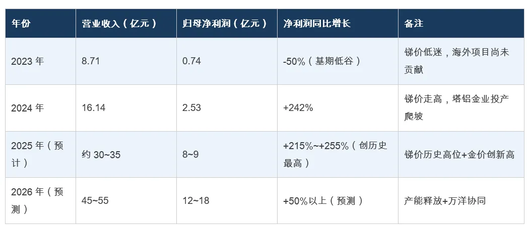 该项目年处理矿石150万吨,设计年产锑1.6万吨。目前已完成产能爬坡基础工作,2025年主要以锑的生产为重点,2026年起随着品位提升和生产优化,锑精矿产量有望进入快速增长通道。值得关注的是,塔铝金业冶炼厂已建成,这意味着公司将逐步从销售精矿向销售精锑转变,产品附加值大幅提升。万洋入主后,若塔铝金业的锑精矿或精锑部分引入万洋冶炼体系消化,综合盈利能力将进一步提升。