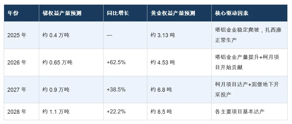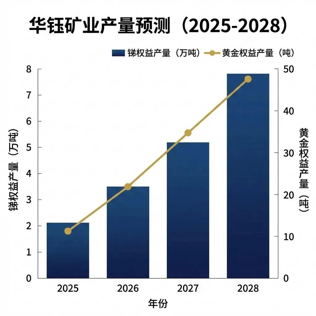 华钰矿业2025~2028年锑与黄金权益产量增长预测柱状图 |