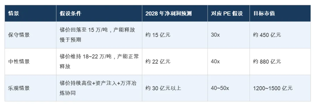 即使在中性情景下,华钰矿业的市值也有望在2027~2028年达到800~900亿元区间;在乐观情景下(亦是我们认为最可能实现的情景),目标市值突破1000亿元具有清晰可见的实现路径。