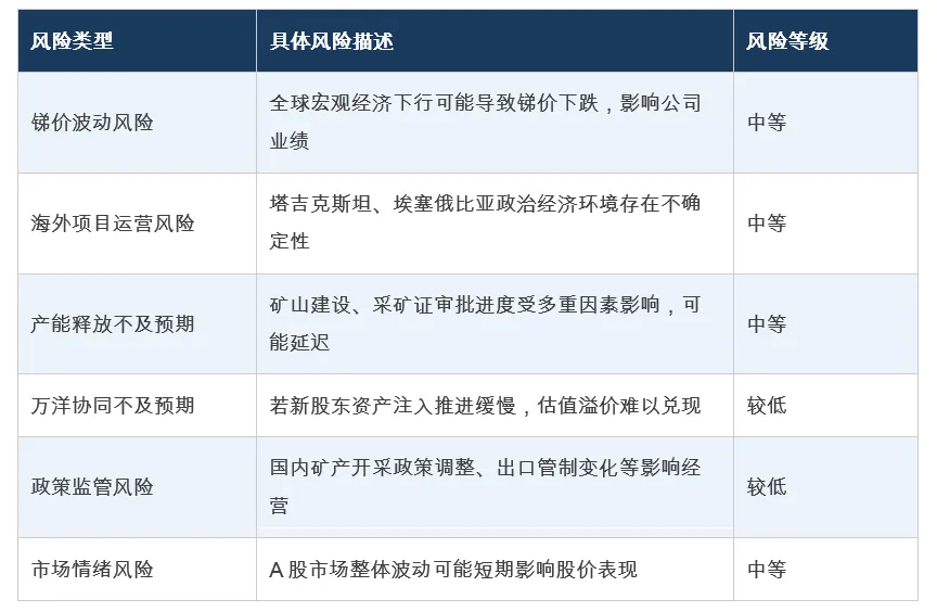 综合来看,上述风险多属于行业共性风险,华钰矿业因资源稀缺性和万洋入主的基本面改善,具备较强的抗风险能力。投资者宜根据自身风险承受能力,合理配置仓位。
