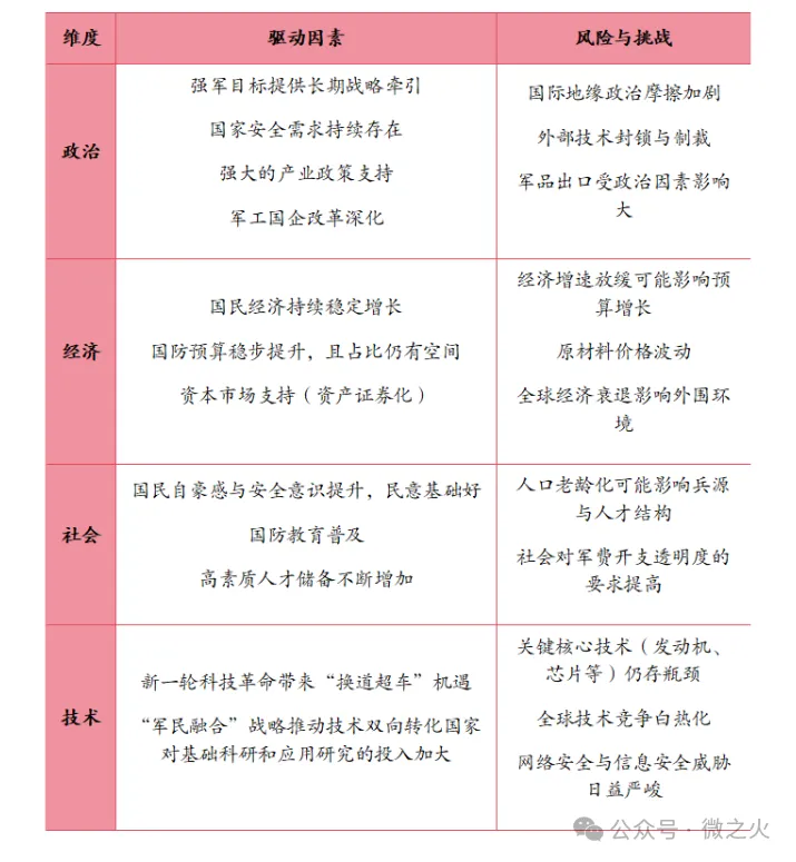 PEST分析旨在从政治、经济、社会和技术四个维度,系统评估影响中国军工行业发展的外部宏观环境。