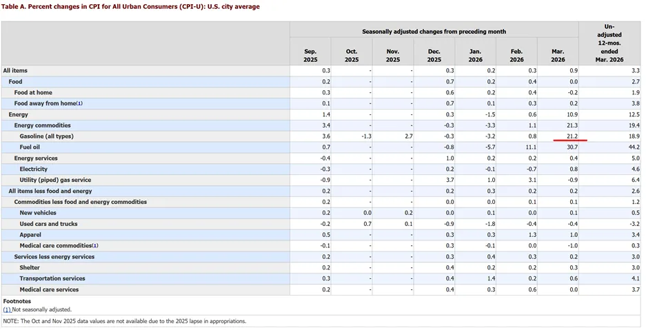 BLS数据显示,3月CPI月环比0.9%、同比3.3%,其中能源分项大涨,汽油单月涨幅达21.2%,几乎贡献了当月总体通胀的大部分增量。换句话说,即使核心通胀没有全面失控,能源冲击也足以让联储在短期内维持更谨慎的政策姿态。