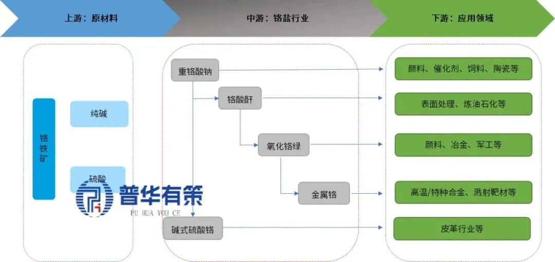 铬盐产业链上游以铬铁矿为起点,主要生产原材料包括铬铁矿、硫酸、纯碱等;铬盐中游主要包括重铬酸钠、铬酸酐、氧化铬绿、碱式硫酸铬等产品;铬盐下游应用领域广阔,包括表面处理、颜料、鞣革、医药、染料、新材料、香料、饲料添加剂、催化剂、化肥、陶瓷、木材防腐、石油天然气开采、军工等多个行业,被誉为“工业维生素”。