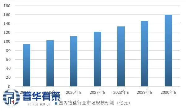 从市场规模来看,2024年国内铬盐行业市场规模达94.1亿元;在新能源电池、高温合金、储能等新兴领域需求的强劲拉动下,预计2025-2030年行业将以9.2%的复合增长率稳步扩张,到2030年市场规模有望突破150亿元,行业整体朝着绿色低碳、高值高效的方向加速演进。