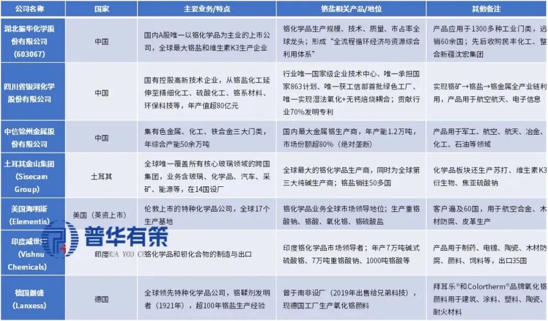 近年来,在国家产业政策的引导下,国内铬盐行业中小企业落后产能逐步出清,亦没有批准新厂商进入,行业集中度不断提升,市场竞争格局比较稳定,目前国内现存的铬盐生产企业主要包括湖北振华化学股份有限公司、四川省银河化学股份有限公司、新疆沈宏集团股份有限公司(已被湖北振华化学股份有限公司通过重整投资方式整合)、中信锦州金属股份有限公司等。与国内相比,国外铬盐行业经过长期竞争整合以后,行业集中度已经达到较高水平,每个大洲或地区通常只有少数铬盐生产企业,比如土耳其金山集团(SisecamGroup)、美国海明斯(Elementis)、印度威世奴(VishnuChemicals)、德国朗盛(Lanxess)等。具体如下: