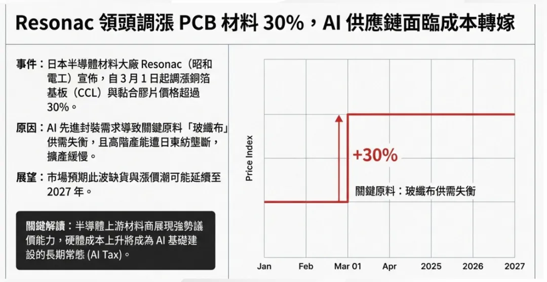覆銅板(CCL)作為PCB核心基材,正經歷一輪由AI需求拉動、原材料成本推動的雙重漲價周期。2025年,建滔積層板多次上調CCL產品價格:2月針對FR4及CEM產品漲價5元/張,8月提價幅度升級至10元/張,12月更「兩連漲」——先對多品類差異化提價5%-10%,月末再對全線材料統一漲價10%。進入2026年,漲價趨勢進一步加速。日本半導體材料巨頭Resonac自2026年3月1日起將CCL及黏合膠片售價上調30%以上,三菱瓦斯化學亦宣佈調漲CCL、Prepreg與CRS等全系列產品,漲幅達30%,自2026年4月1日起適用。建滔積層板亦因化工產品供應緊張和成本上升,將板料和PP(半固化片)價格上調10%。中信證券明確指出,PCB板塊持續強勢的核心邏輯之一即為「漲價」。2025年Q4以來覆銅板已落地漲價約15%-20%,預計2026年上半年進一步漲價10%-20%,相關公司有望加速釋放顯著利潤彈性。1.3 AI PCB上游材料全線漲價