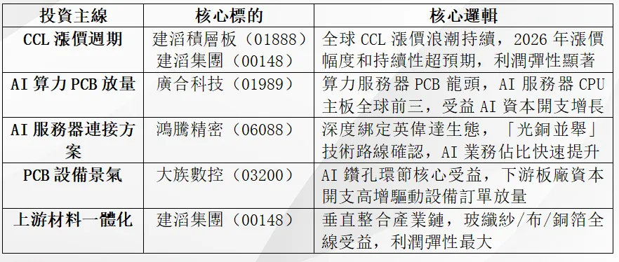 中信建投:受益於AI推動,全球PCB行業迎來新一輪上行週期。2026年GPU+ASIC服務器對應PCB市場空間超900億元,增速已翻倍,此輪PCB大週期仍在上行,PCB全產業鏈均將受益。中信證券:AI PCB行業底層增長邏輯並未改變且在不斷強化,後板塊存在密集潛在催化,龍頭廠商業績預期整體仍在逐步兌現,估值水平存在進一步上修空間。2026年初以來PCB板塊相對滯漲,主要受算力/AI整體beta偏弱及市場擔憂應用拓展擾動、升規升階延後、業績兌現滯後、材料漲價影響等因素影響。國金證券:AI PCB上游材料全線漲價,2026年是基本面的驗證年,有望在龍頭企業報表端驗證到量價齊升。近期儘管外圍變動影響情緒,但基本面一直在線,AI PCB上游新材料依然受到市場青睞。4.2 核心投資主線