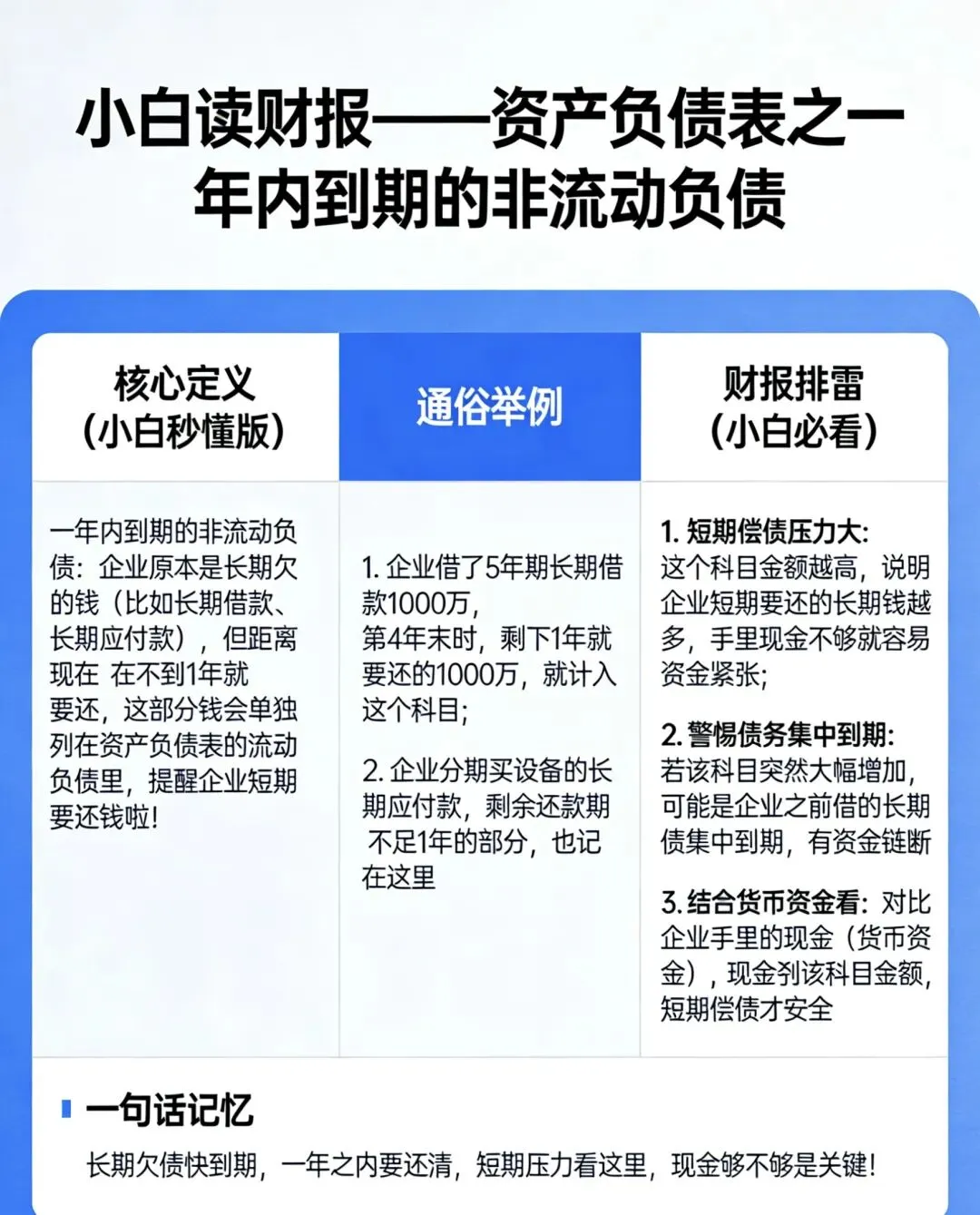 总结:一年内到期的非流动负债是企业短期流动性的 “生死线”,它不是 “长期债务”,而是今年必须还的 “硬债”。分析时核心抓 “规模、增速、偿债能力、再融资”四大维度,结合货币资金、经营现金流、其他负债联动验证,可快速识别流动性危机与财务造假风险。若觉得文章有帮助到你,点赞关注,会不定期分享干货,点击名片即可关注:作者提示:以上内容仅是个人观点,不构成投资建议。股市有风险,投资需谨慎。