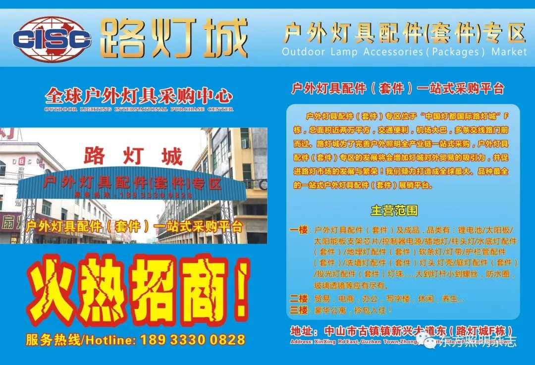“路灯城户外灯具配件(套件)专区”位于灯都古镇国际路灯城F栋,花巨资倾力打造而成的品种齐全的一站式户外灯具配件(套件)展销平台,实现综合配套服务平台。为提升路灯城整体形象,加快形成路灯城商圈,解决路灯城进驻商户销售通路,提高市场份额及曝光率,从而促进市场繁荣。