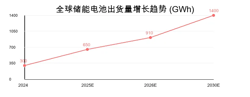2024 年中国储能电池出货量 153GWh(同比 +87.4%) 2025 年预计出货量超 320GWh(交流侧,同比 +80%) 2026 年增速预计 40%-60% 2026-2030 年 CAGR 20.7%-25.5%