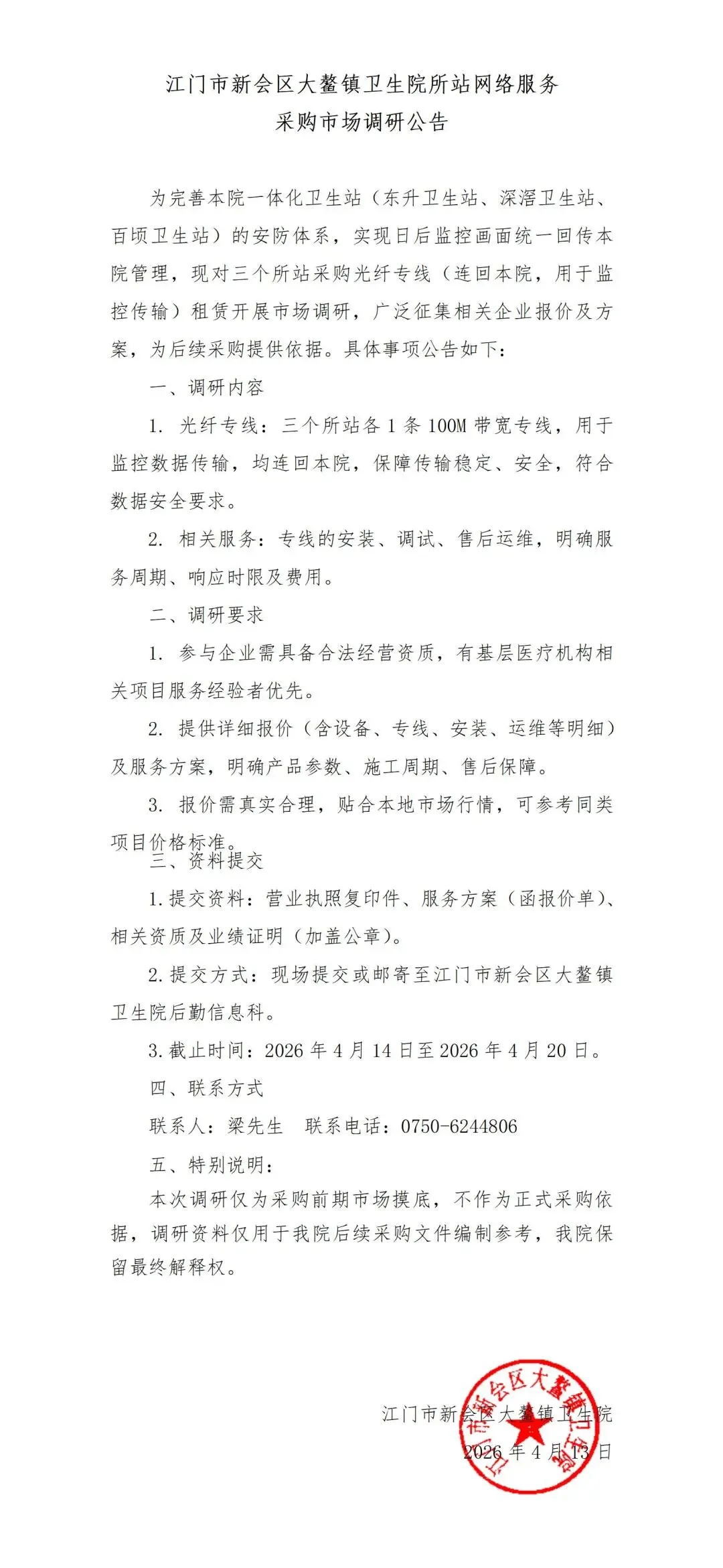 【调研公告】江门市新会区大鳌镇卫生院所站网络服务采购项目公告