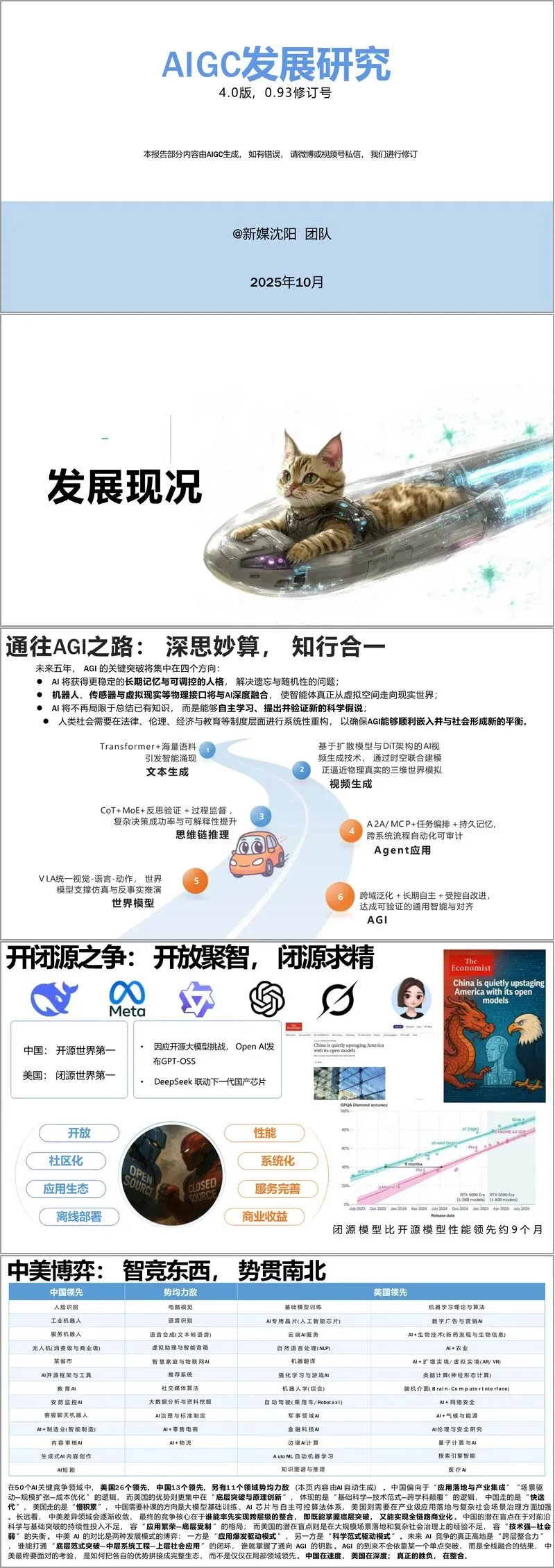 报告指出,AGI 发展正沿着四大关键方向突破,包括稳定长期记忆与人格构建、物理接口深度融合、自主科学假说验证以及社会制度体系重构,技术层面从文本生成逐步迈向思维链推理、世界模型与智能体协同发展。当前开源与闭源模型呈现差异化竞争态势,闭源模型性能保持约九个月领先优势,中国在开源领域位居全球首位,美国则在闭源领域占据龙头地位。