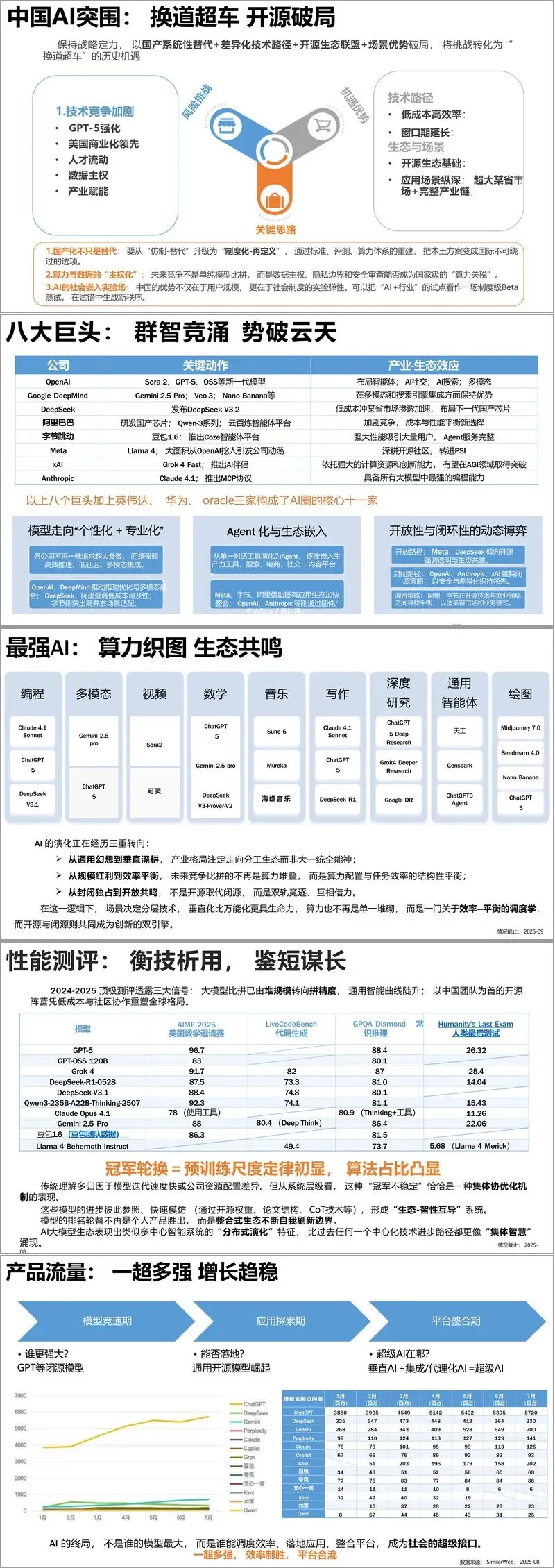 产业层面,八大科技企业与英伟达、华为、甲骨文构成 AI 核心阵营,各企业依托技术优势布局智能体、多模态、商业化生态。模型竞争已从参数规模比拼转向精度、效率与个性化发展,性能测评呈现冠军轮换特征,彰显分布式演化与集体智慧涌现的行业趋势。产品流量格局呈现一超多强态势,ChatGPT 保持领先,国产模型稳步增长,行业进入平台整合与效率制胜阶段。