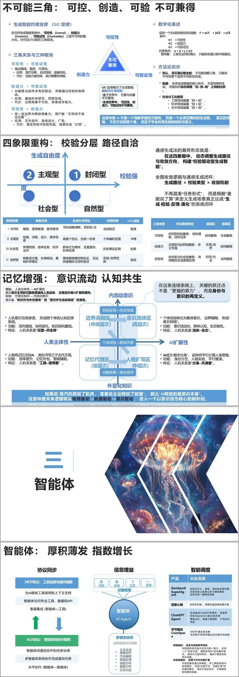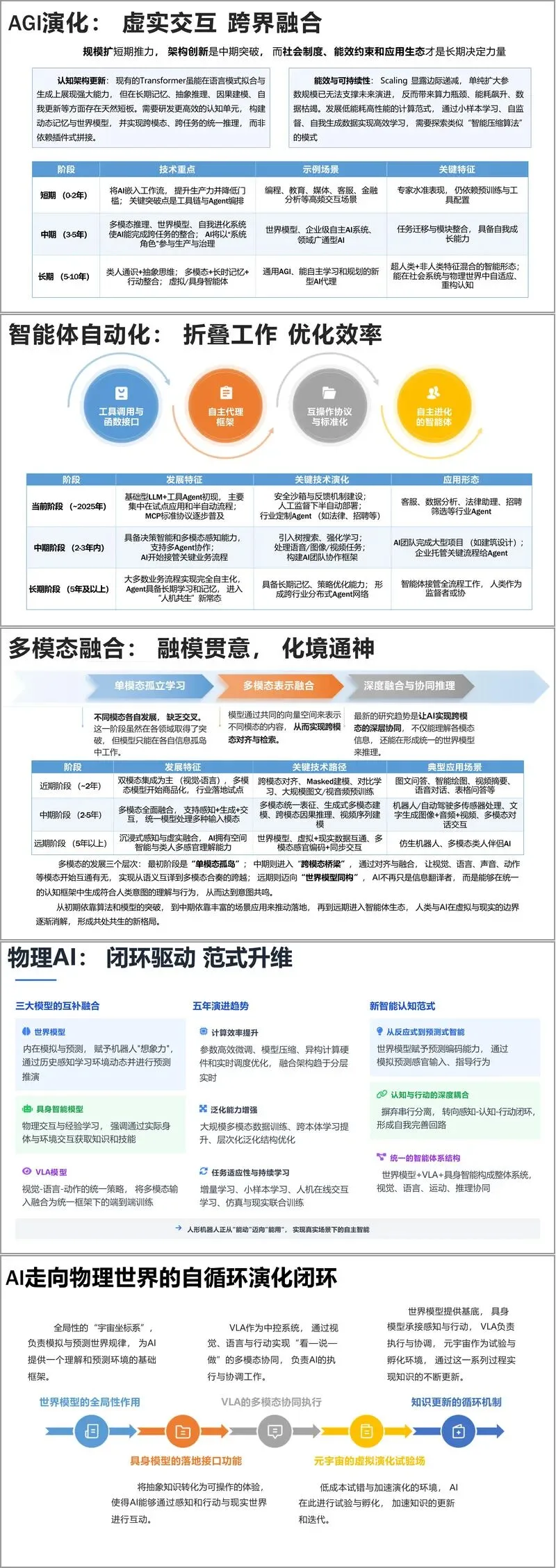 应用领域覆盖智能体、多模态、物理 AI、内容生产、科研创新、文娱创作、行业赋能等多元场景。智能体实现从工具到自主协作的升级,依托 MCP、A2A 协议完成复杂任务;多模态技术从单模态孤立发展到跨模态融合,最终迈向世界模型同构;物理 AI 通过世界模型、VLA 模型与具身智能融合,推动 AI 走向现实世界。内容生产层面,AI 赋能文学、美术、音乐、视频、编程等领域,实现创作效率革新与范式重构,同时明确了 AI 生成内容的著作权归属与独创性认定标准。