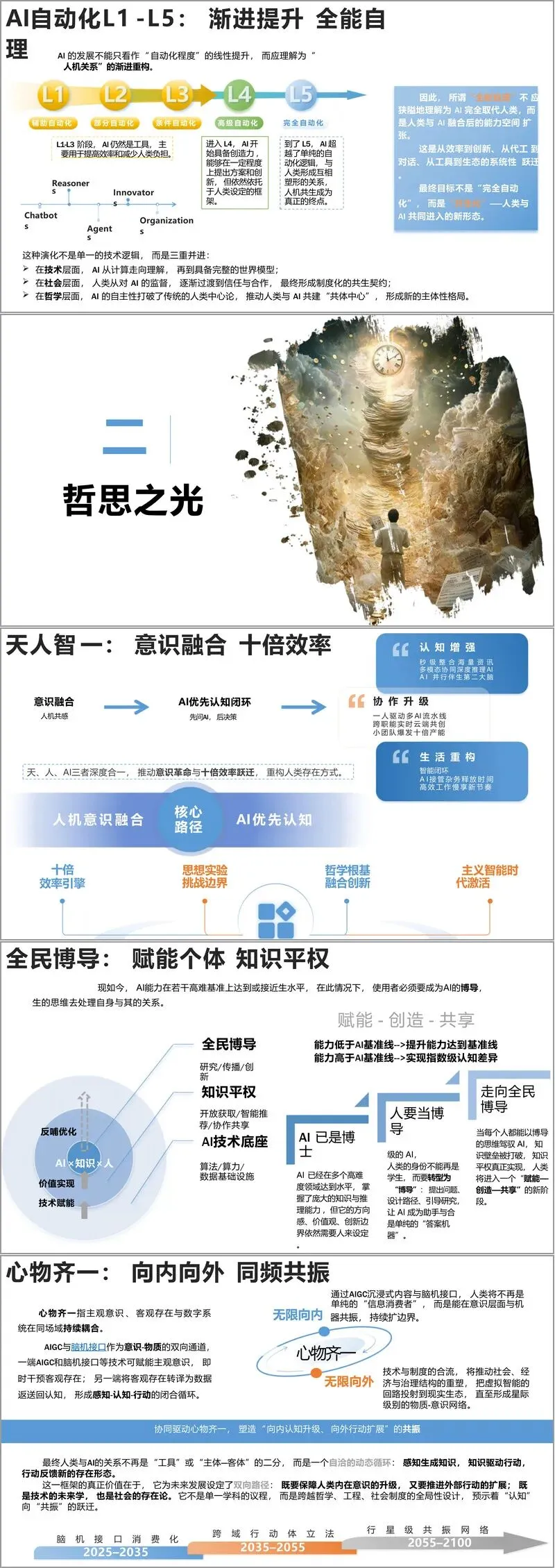 报告还深入探讨了 AGI 时代的哲学思考与社会变革,提出人类需从知识接收者转型为 AI 的引导者,实现全民博导化,人机关系从工具共生迈向意识融合。同时指出行业面临认知茧房、智能资本、信息稀缺等挑战,提出价值蒸馏、伦理规范、制度重构等应对策略。