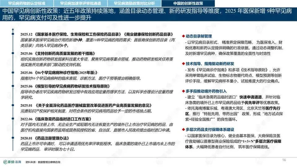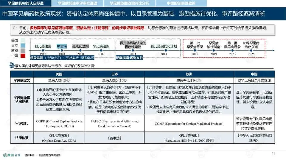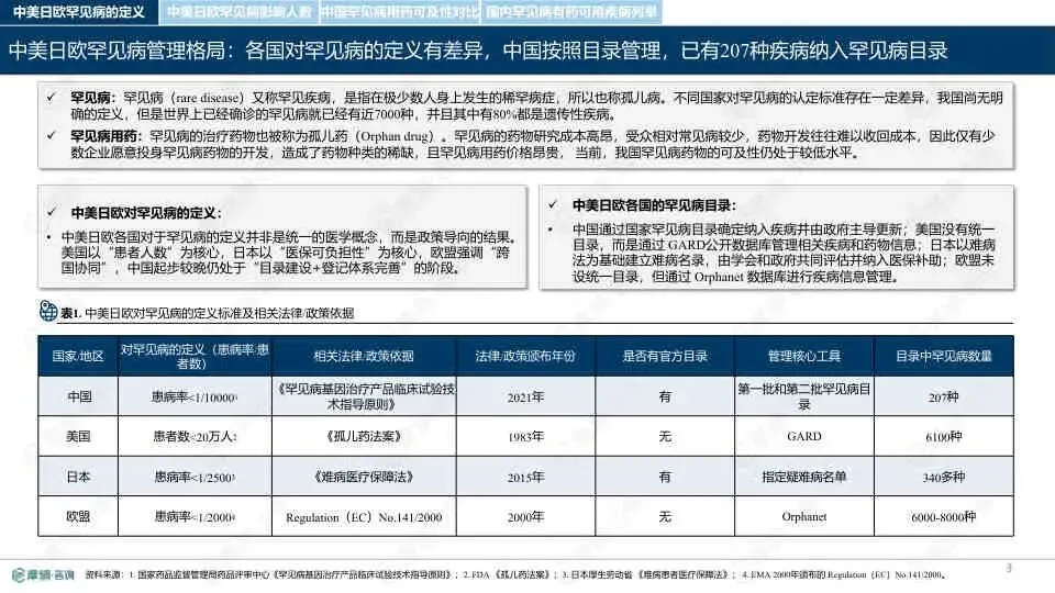 - 定义标准:美国以患者人数(<20万)为核心;日本侧重医保可负担性(患病率<1/2500);欧盟强调跨国协同(患病率<1/2000);中国采用目录管理(患病率<1/10000)。