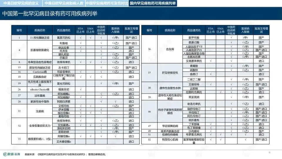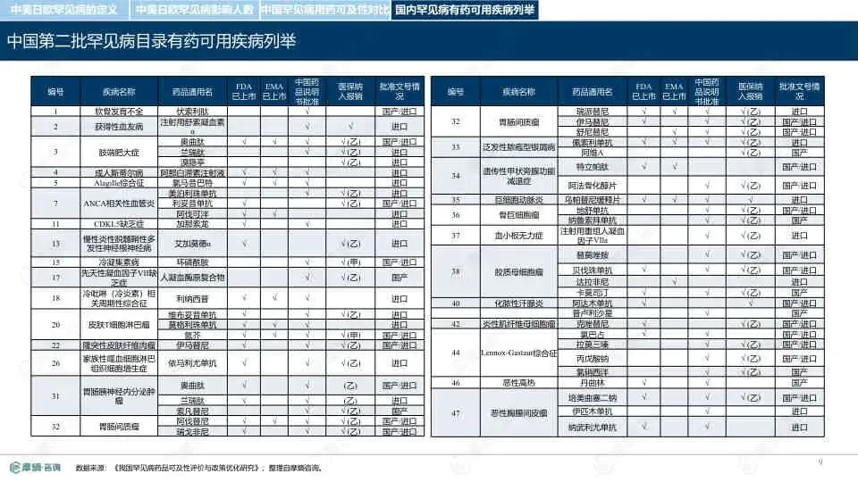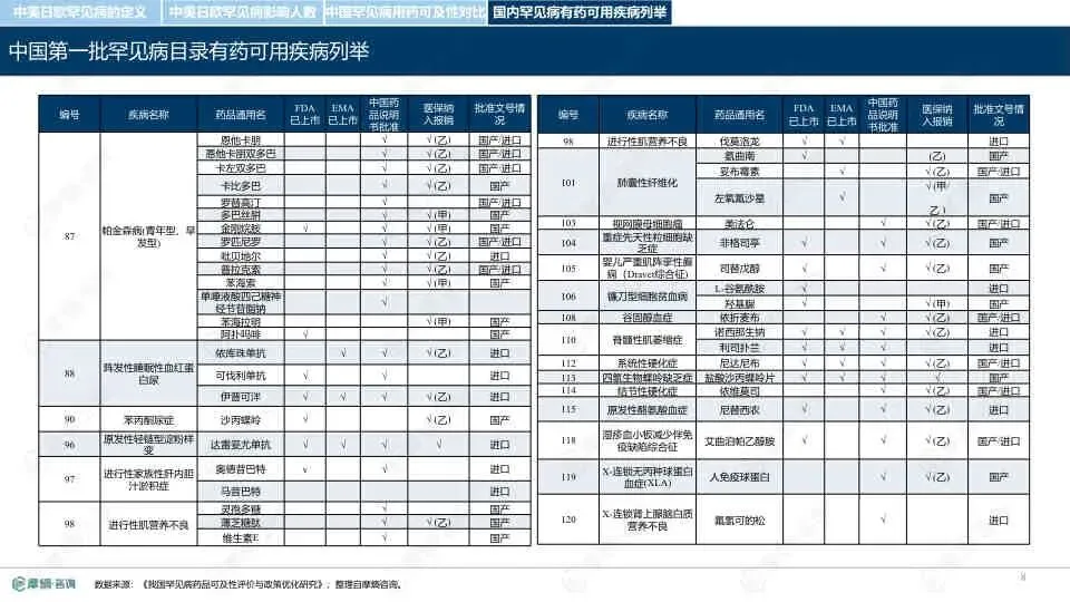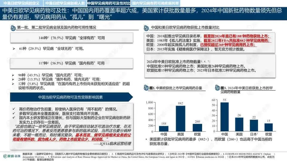 - 中国现状:中国罕见病目录已纳入207种疾病,其中146种(70.5%)全球有药,117种(56.5%)国内有药。存在28种“境外有药、境内无药”的情况。