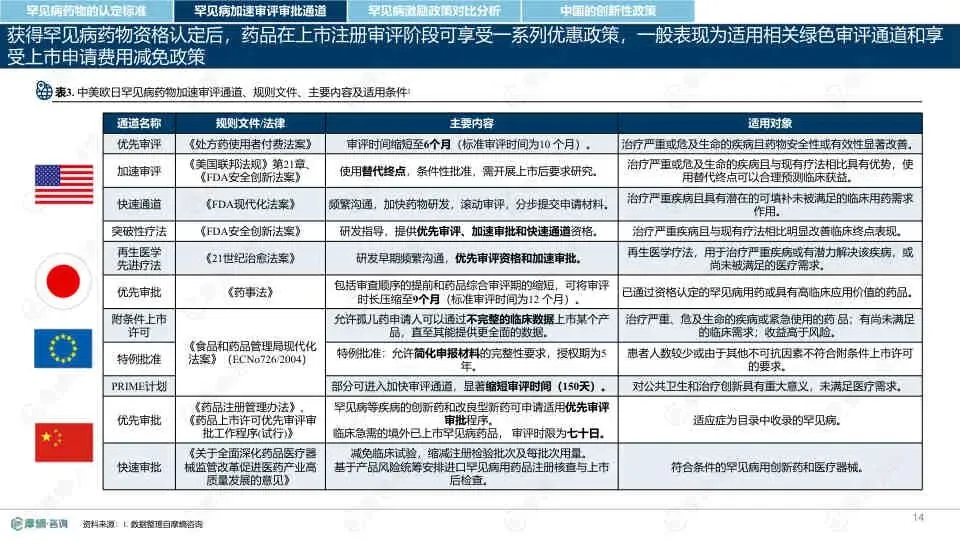 - 审批加速:各国均设有优先审评、突破性疗法等加速通道。中国实施优先审评审批,临床急需境外已上市罕见病药品审评时限缩短至70日。