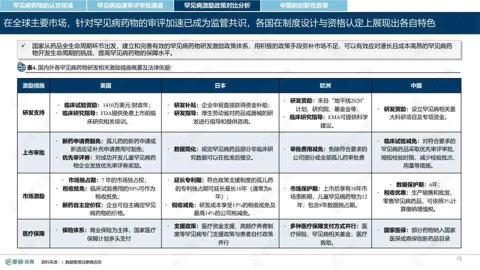 - 美国:拥有最成熟的体系,提供7年市场独占期、税收抵免(临床费用50%)及研发资助。