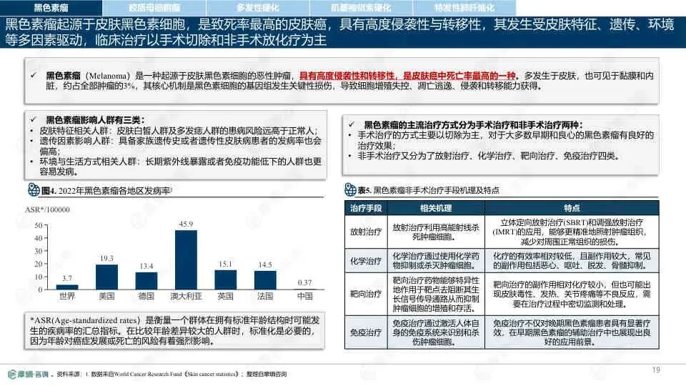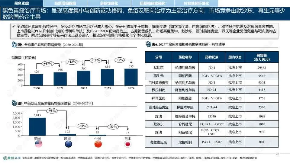 - 黑色素瘤:免疫治疗与靶向治疗为主流。PD-1抑制剂(如帕博利珠单抗)及BRAF/MEK抑制剂占据主导。默沙东、百时美施贵宝等企业凭借高额销售额占据市场核心。