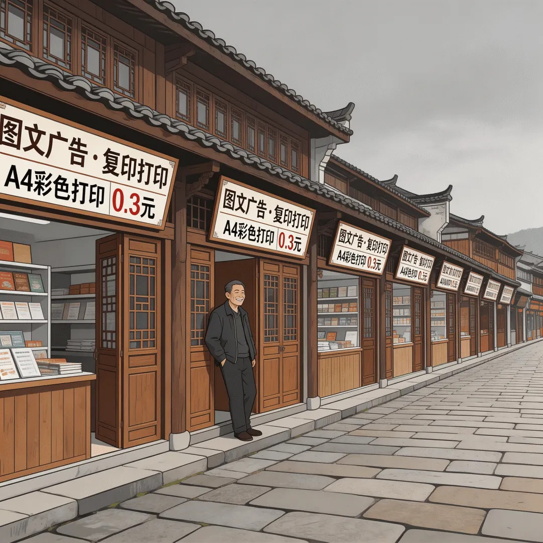 在湘西凤凰古城,短短500米内竟然开了8家广告图文店,价格战惨烈:一张A4彩打从1元跌至0.3元,甚至低于白菜价格。店主老吴苦笑说:“我们现在连卖白菜还不如,白菜还能涨价呢。”