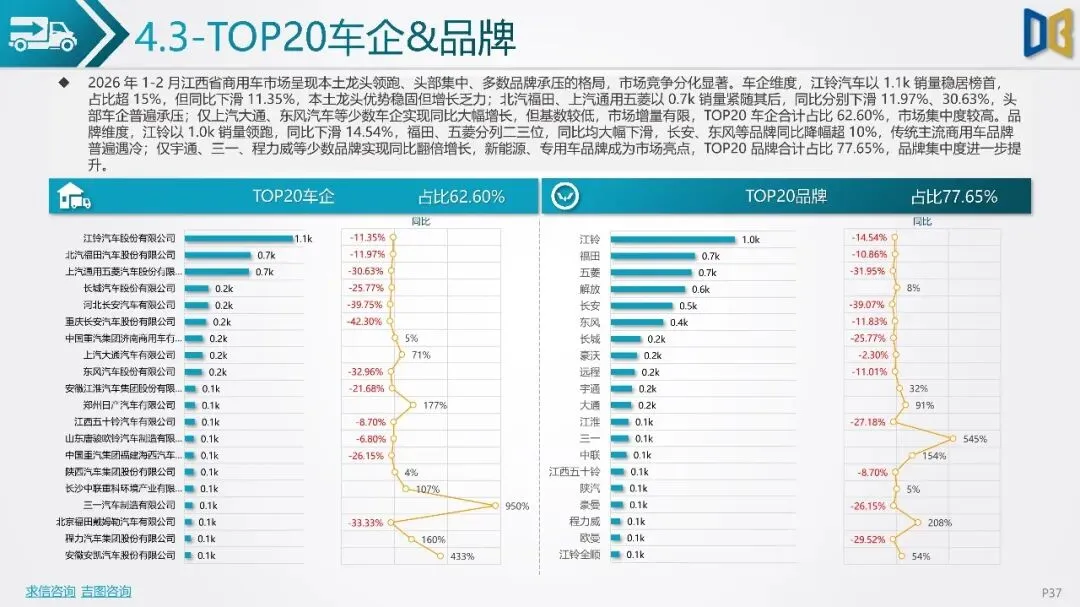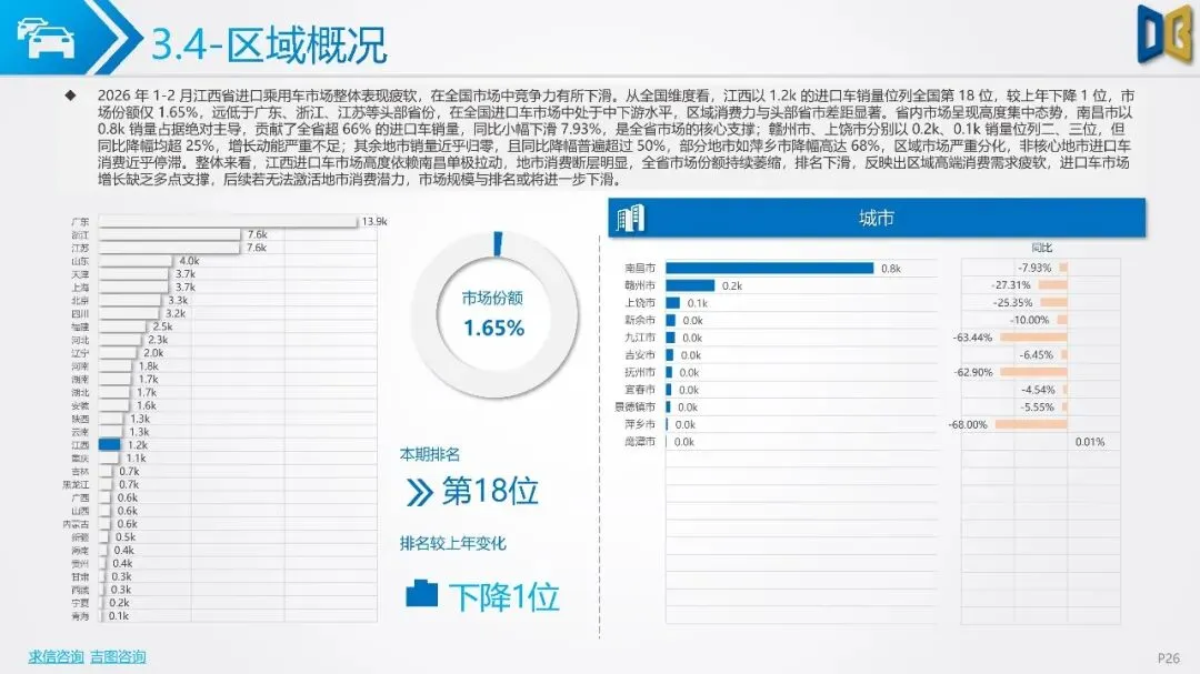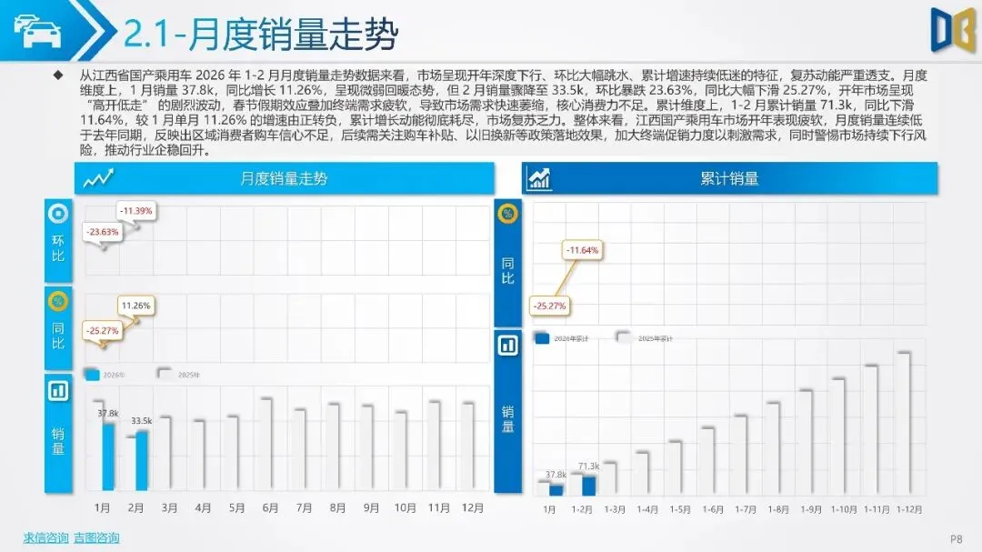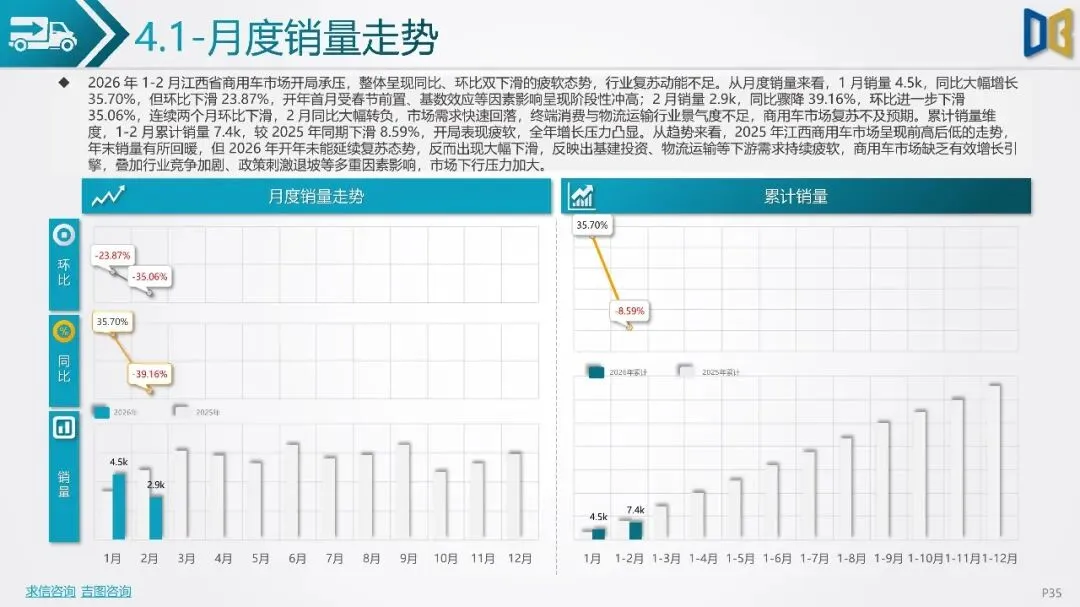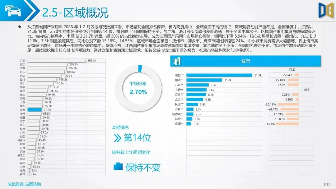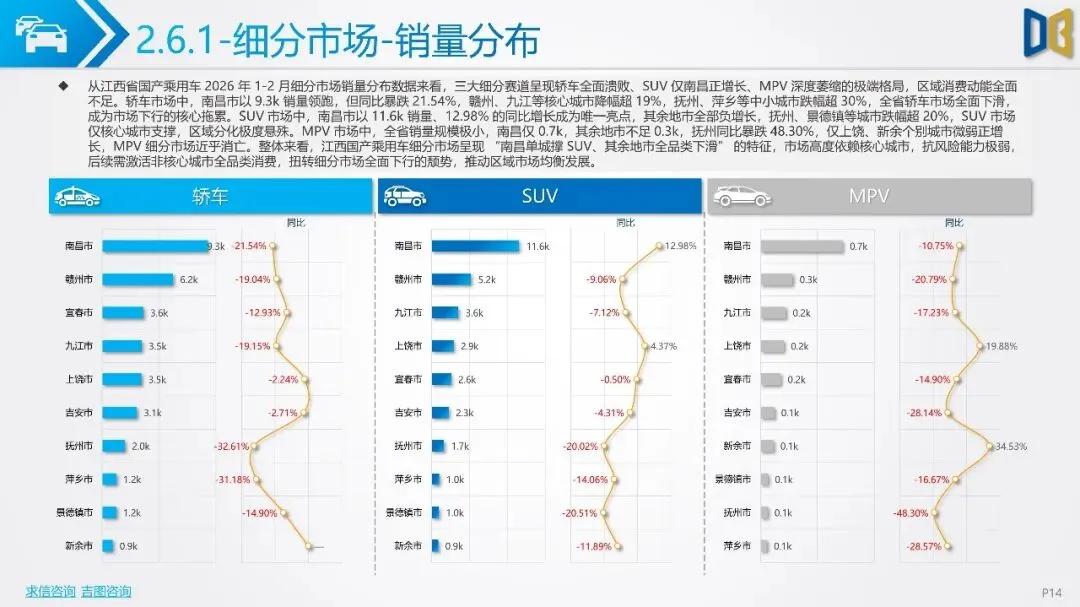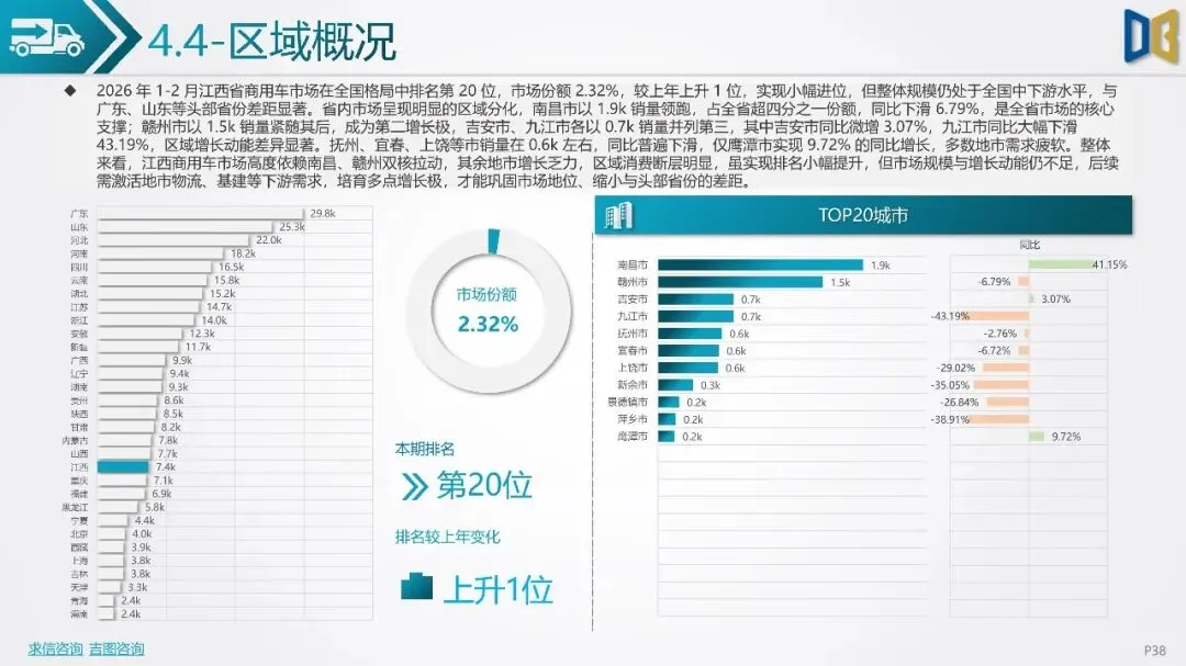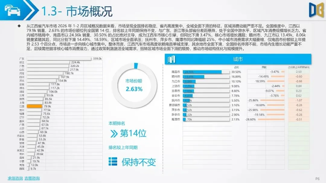 商用车市场同样承压,月度销量同比大幅下滑,货车成为市场核心,新能源商用车加速渗透。分城市看,南昌市为核心引擎,但同比下滑,其他地市全面承压。车企方面,头部品牌份额下滑,新势力品牌成为增长亮点。整体来看,江西省汽车市场面临较大增长压力,需政策刺激与消费提振以推动市场复苏。