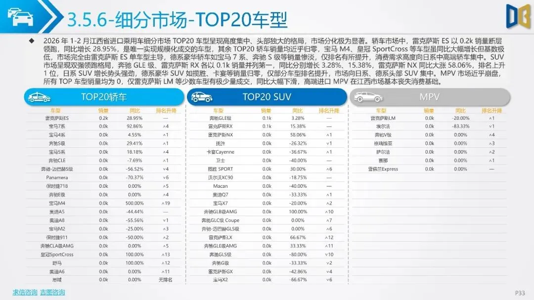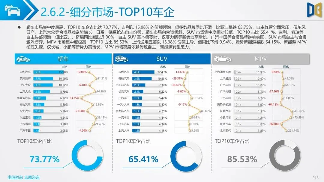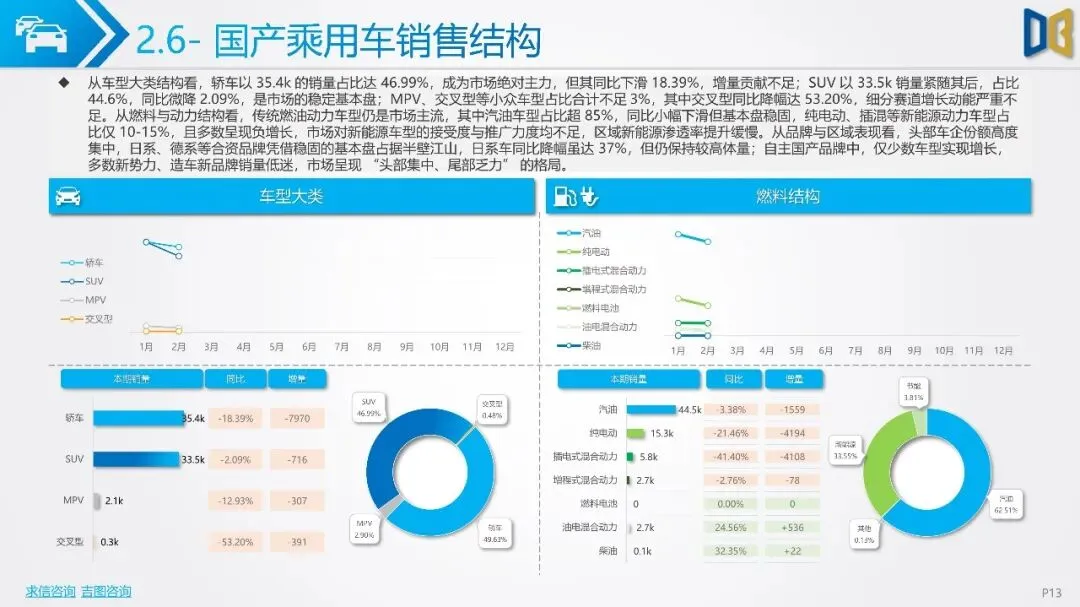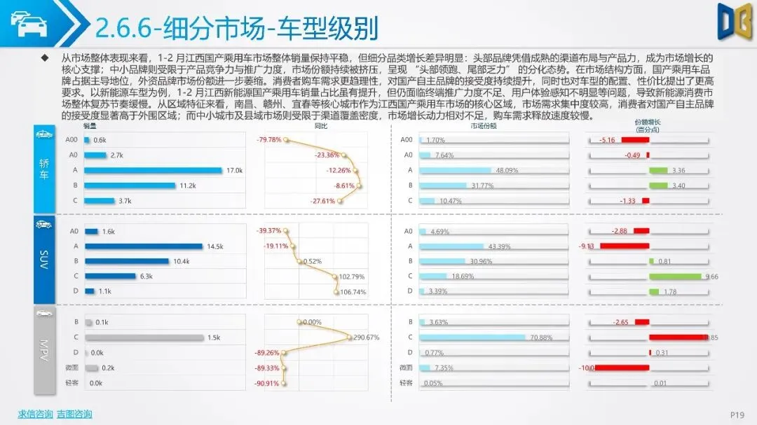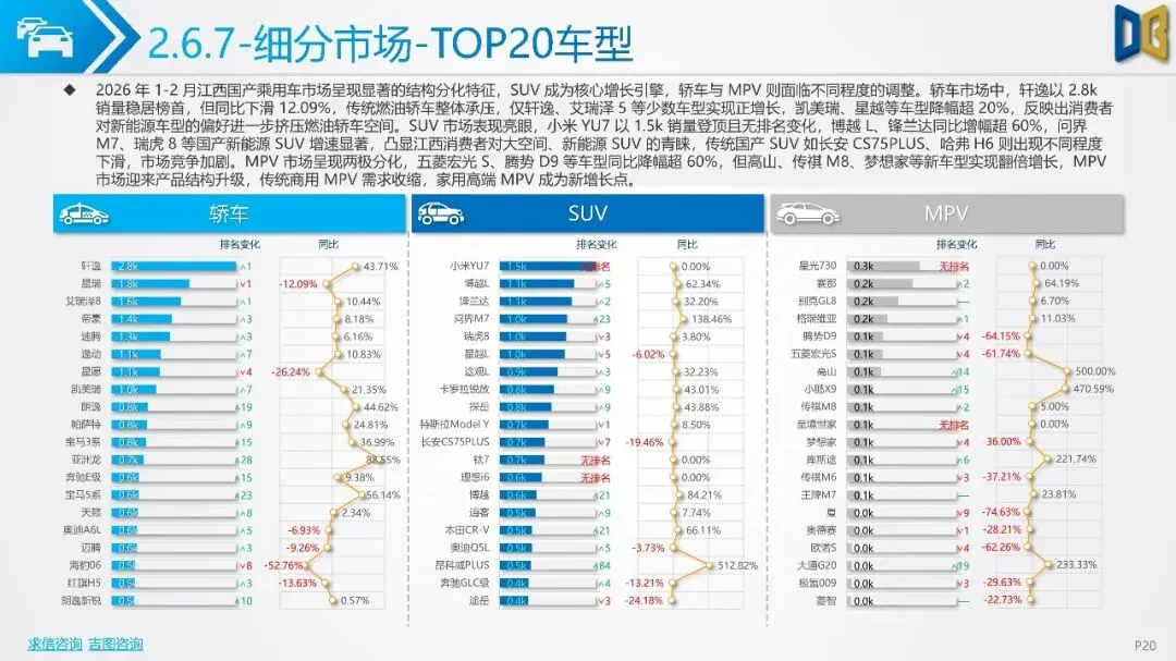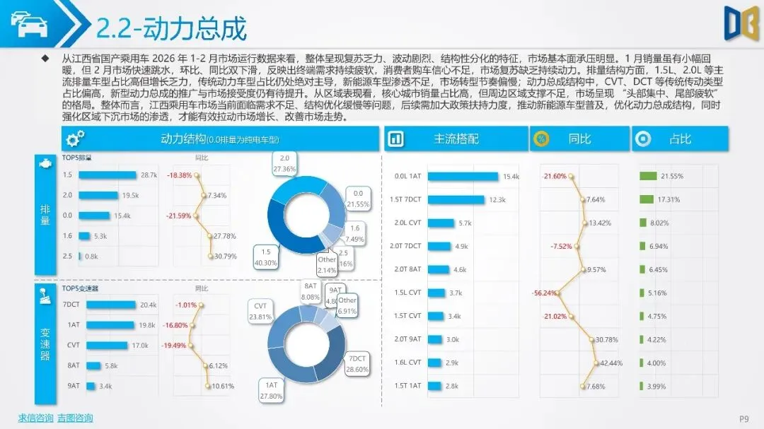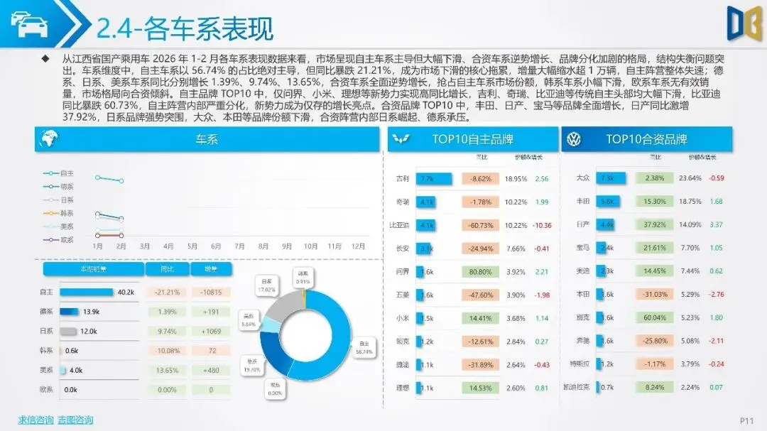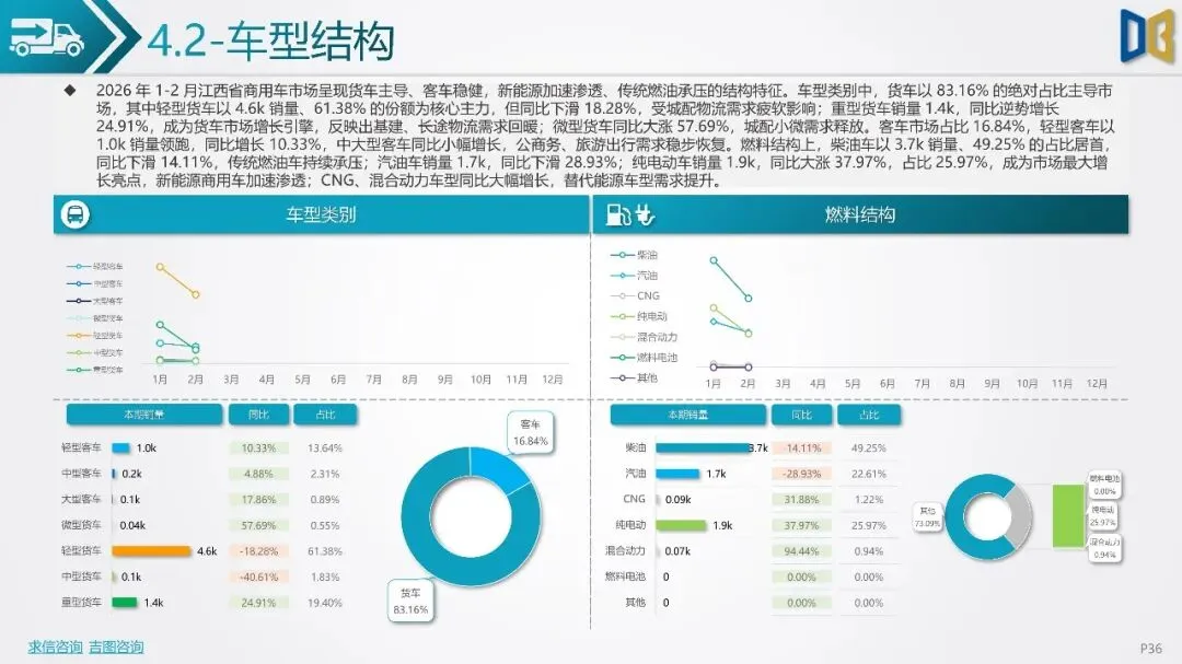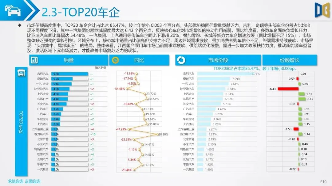 商用车市场同样承压,月度销量同比大幅下滑,货车成为市场核心,新能源商用车加速渗透。分城市看,南昌市为核心引擎,但同比下滑,其他地市全面承压。车企方面,头部品牌份额下滑,新势力品牌成为增长亮点。整体来看,江西省汽车市场面临较大增长压力,需政策刺激与消费提振以推动市场复苏。