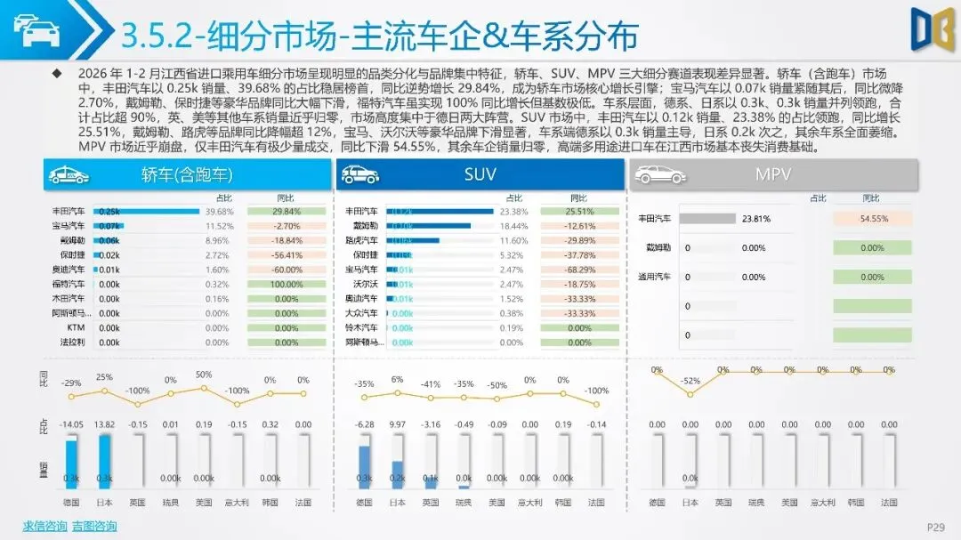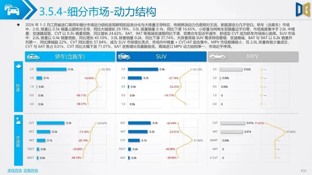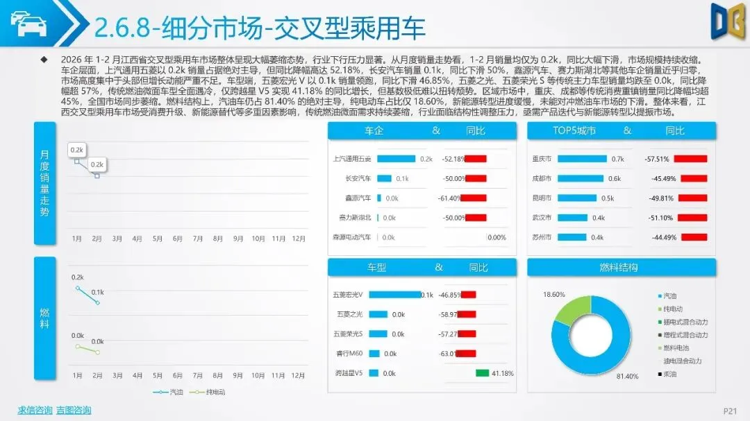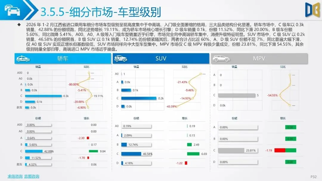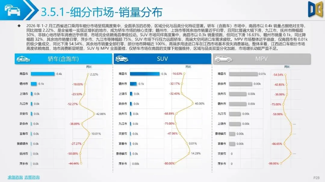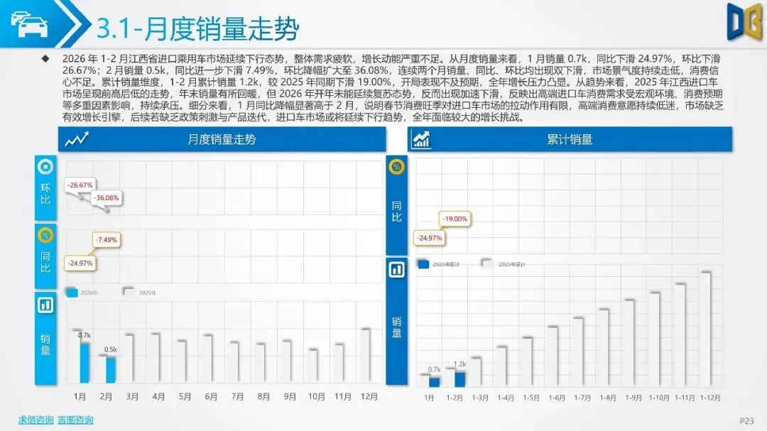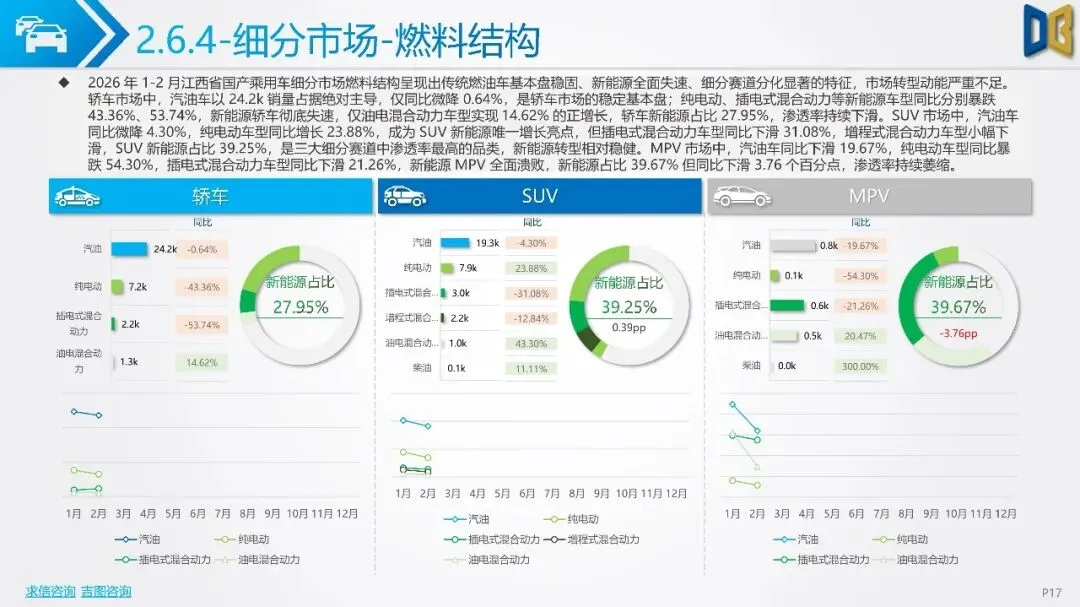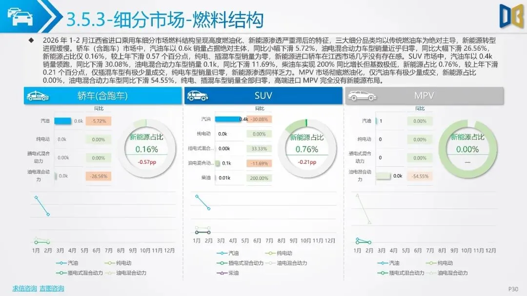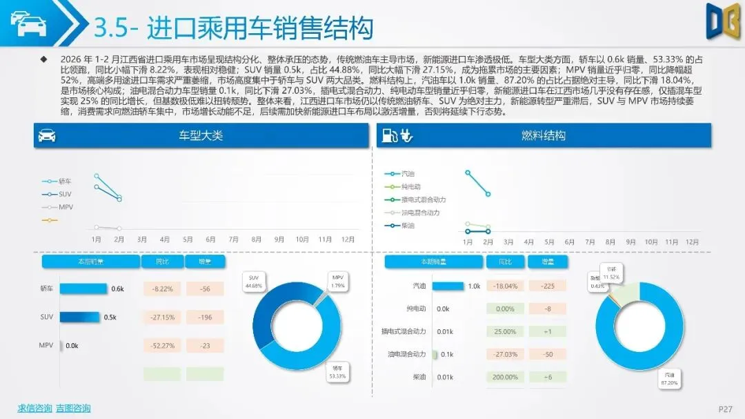 江西省汽车市场开年持续下行,环比同比双降,累计增速大幅回落。国产乘用车占据市场主导,但月度销量深度下行,SUV成为核心增长引擎,轿车与MPV市场全面承压。新能源车型全面失速,传统燃油车基本盘持续缩水。进口乘用车市场延续下行态势,高端进口车消费需求疲软。