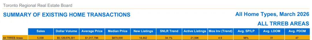 根据 Toronto Regional Real Estate Board 官方数据: