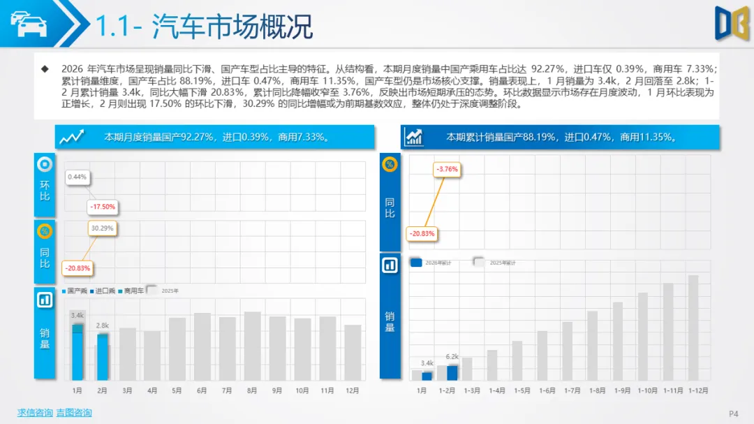 本期商用车市场开局高增后快速回落,传统燃油货车主力受挫,仅客车、混动、个别区域实现逆势增长,市场整体复苏动能不足。后续需重点关注政策刺激、新能源货车渗透提升,以及核心区县需求修复,警惕市场持续下行风险。