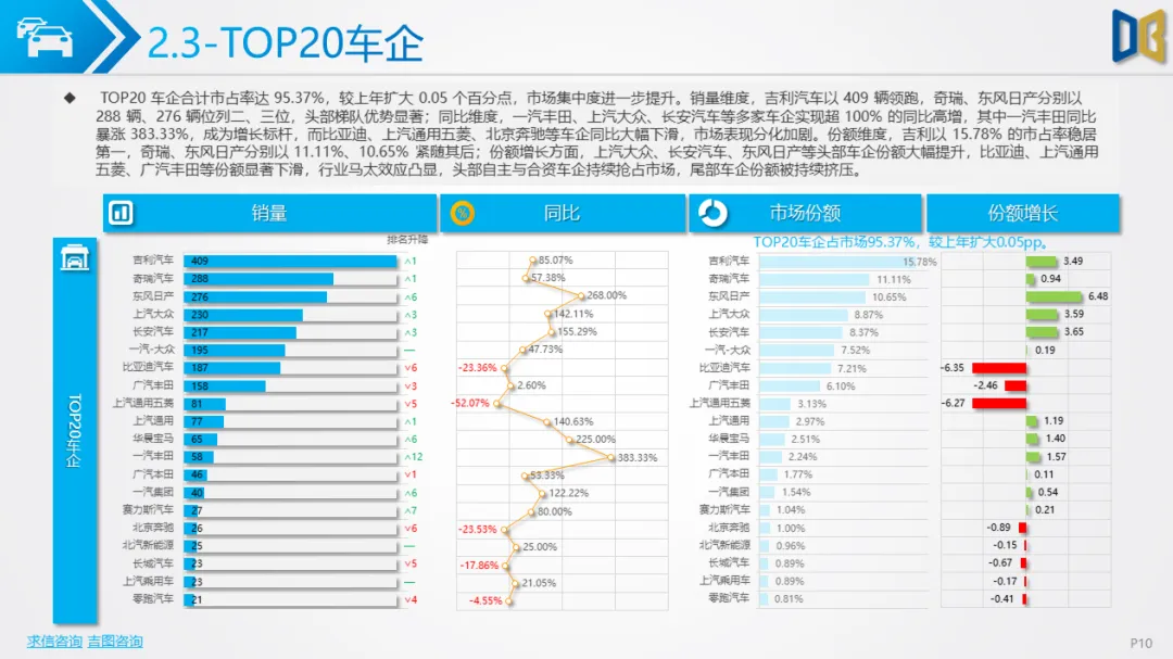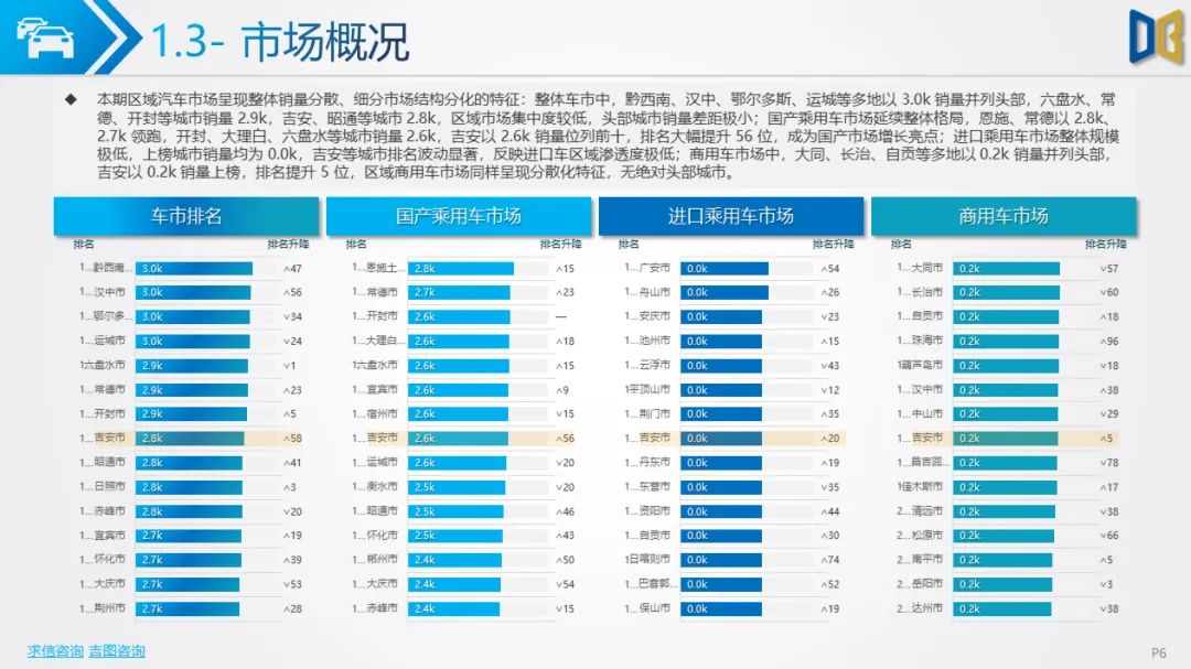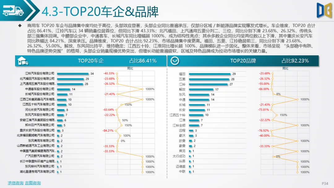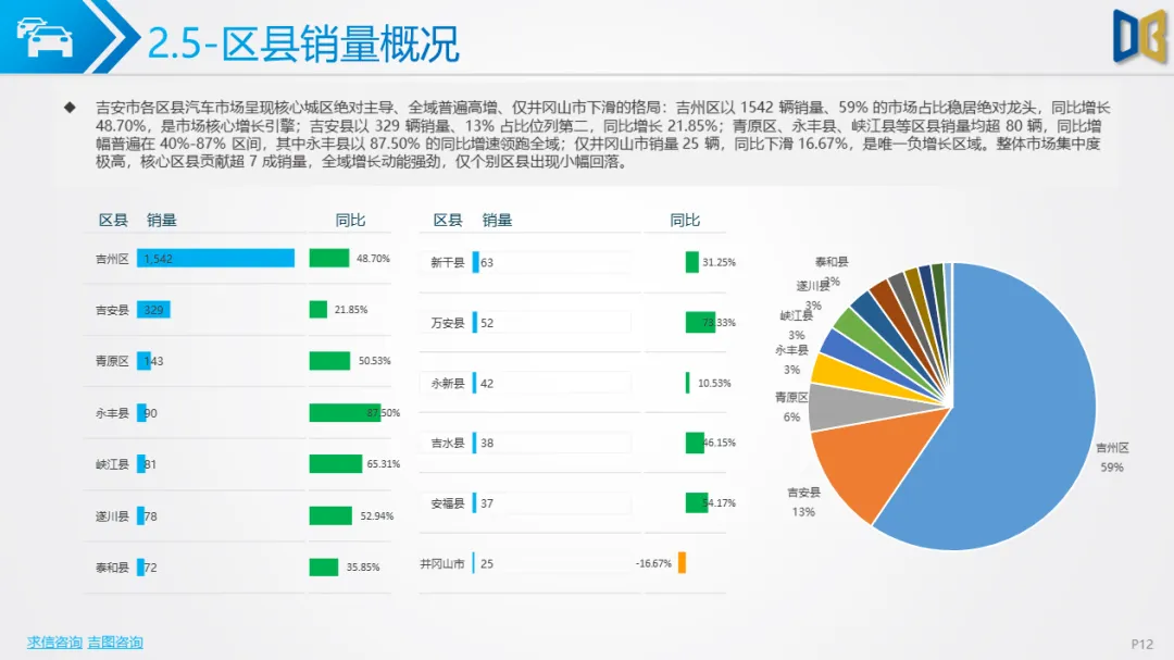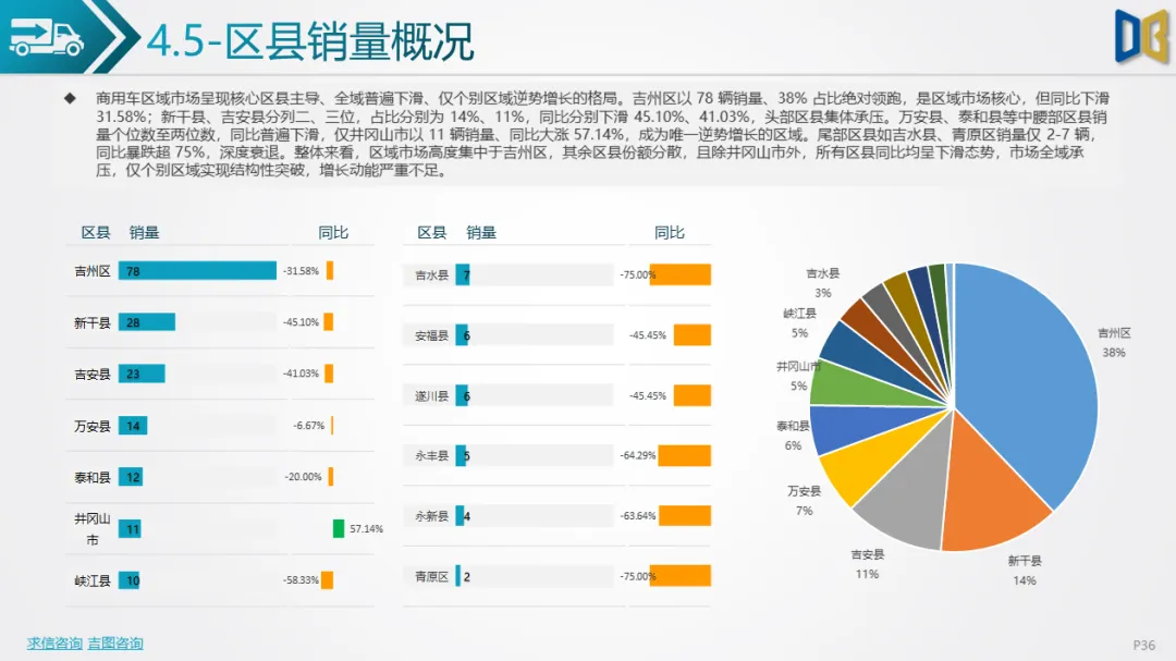 TOP20车企/品牌集中度高(车企占比86.41%、品牌占比92.23%),江铃、北汽福田、上汽通用五菱稳居头部,但同比普遍下滑;中通客车、长城汽车等企业同比爆发式增长,成为结构性亮点,市场呈现 “头部集中承压、特色品牌突围” 的分化态势。区域格局:市场高度集中于吉州区(38%占比),新干县、吉安县分列二、三位;除井冈山市同比大涨57.14%外,其余所有区县同比普遍下滑,吉水县、青原区等尾部区县同比暴跌超75%,全域市场深度承压。