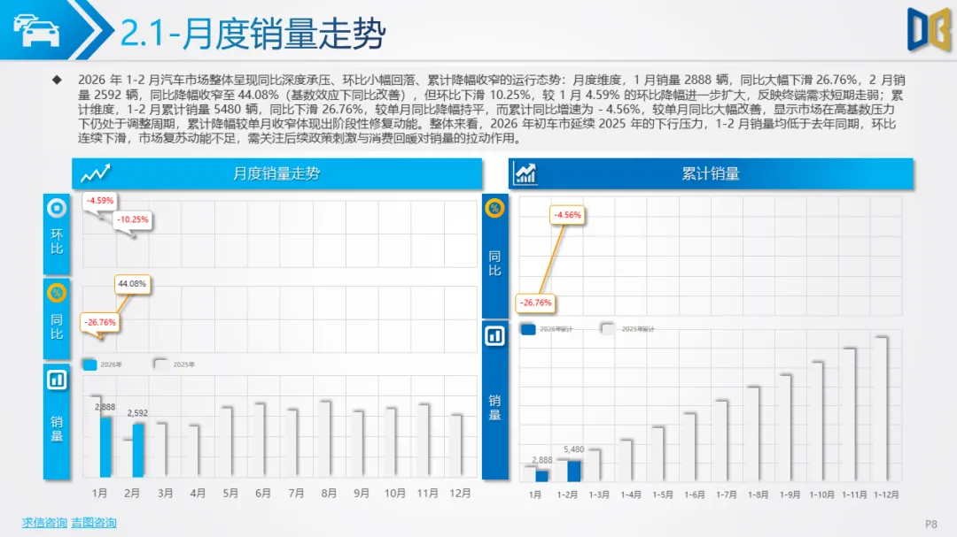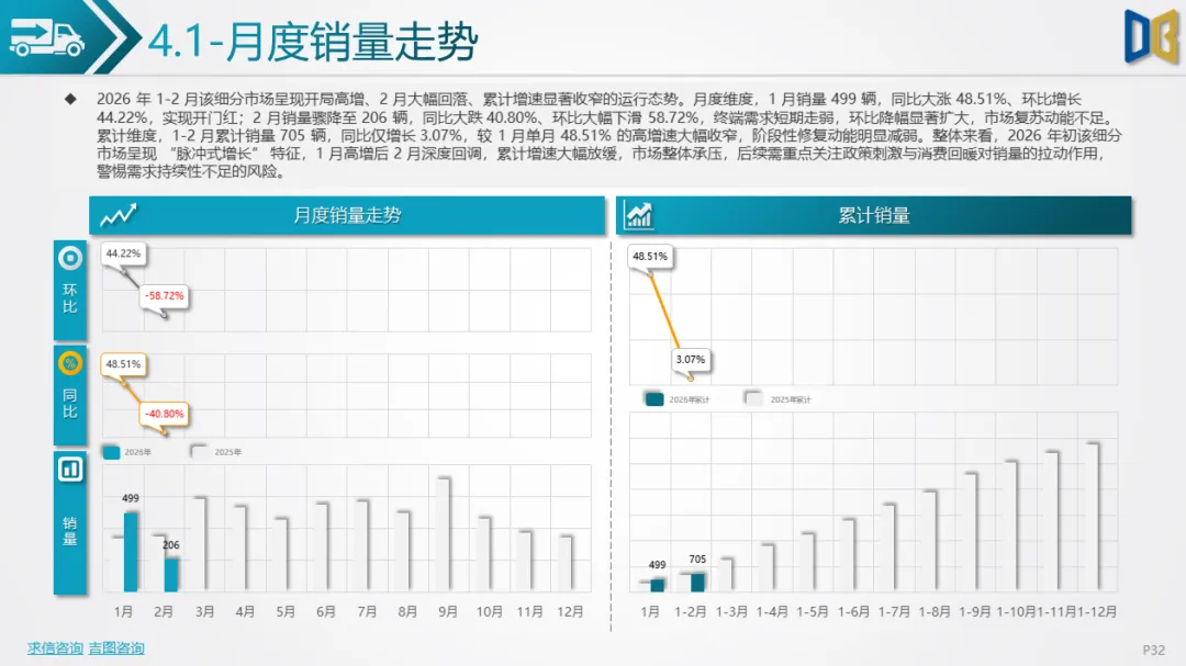 2026年1-2月市场呈现 “脉冲式增长”:1月销量499辆,同比大涨48.51%、环比增长44.22%,实现开门红;2 月销量骤降至206辆,同比大跌40.80%、环比大幅下滑58.72%,终端需求快速走弱。1-2月累计销量705辆,同比仅增长3.07%,增速较1月大幅收窄,市场复苏动能严重不足,后续增长压力较大。