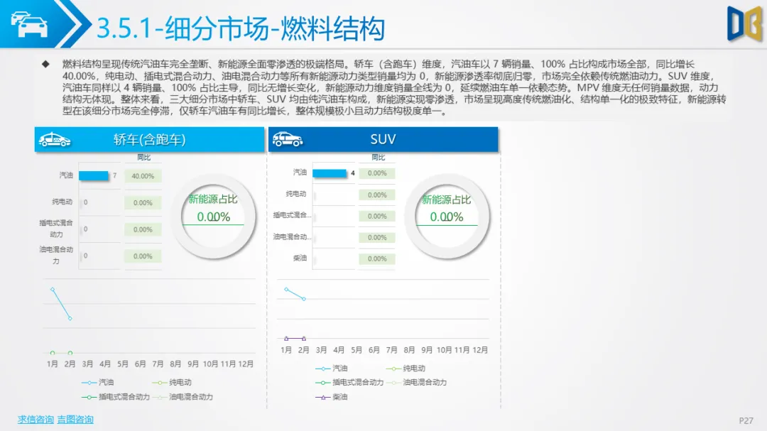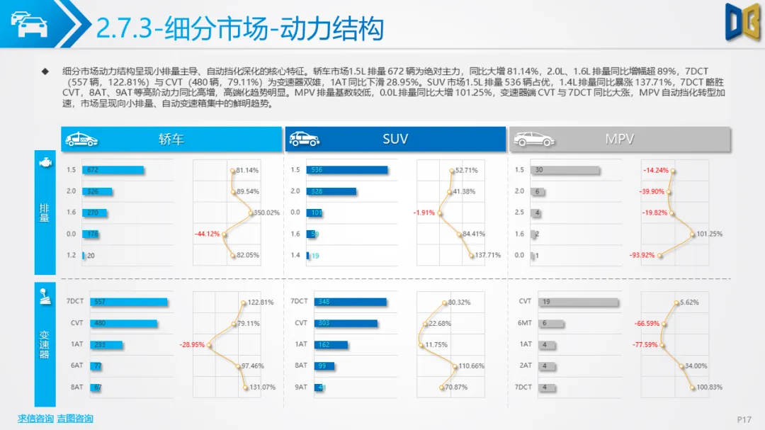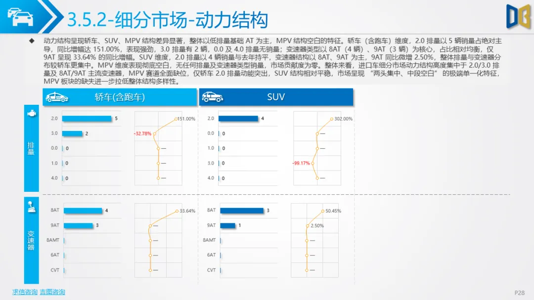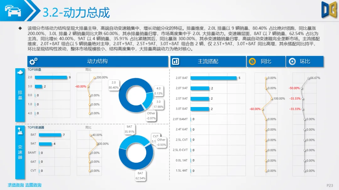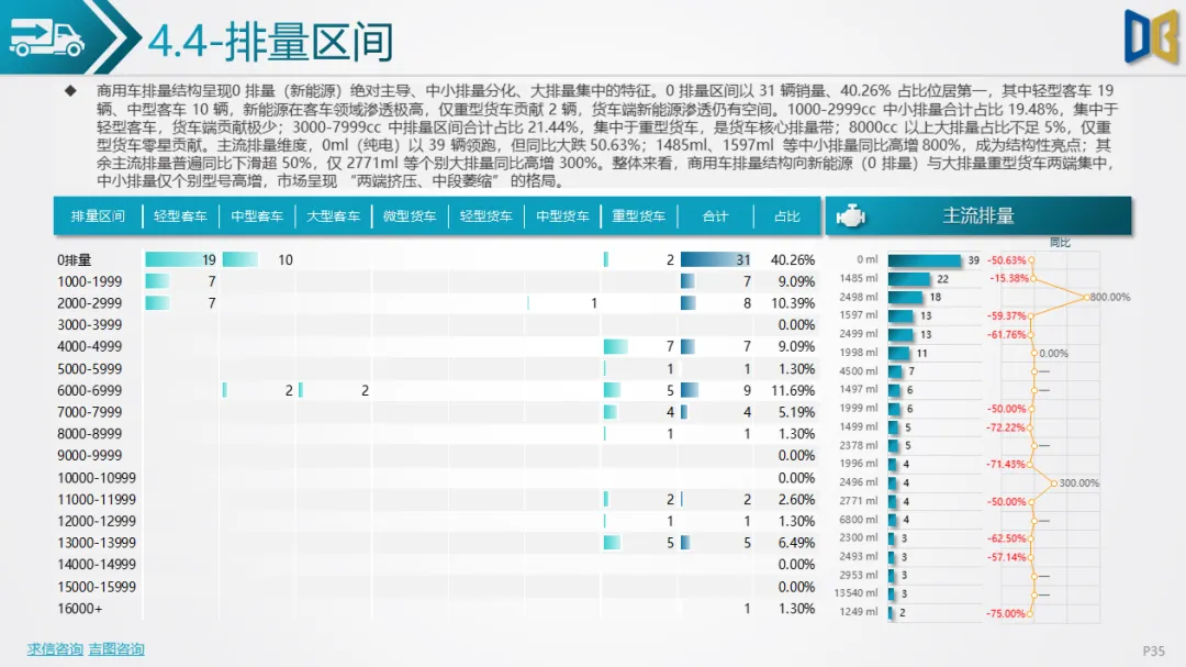 货车以77.18%占比绝对主导,轻型货车为核心(128辆,占比62.14%),但同比大跌48.80%,重型货车同步下滑57.14%,货车板块全面承压;客车占比22.82%,中型客车同比暴涨500%,成为市场唯一增长引擎。动力结构:传统燃油车全面失速,柴油、汽油车同比分别下滑38.75%、44.34%;纯电动车同比腰斩50.63%,仅混合动力同比大涨350%,成为唯一高增动力类型,新能源渗透呈现 “客车高、货车低” 的分化格局。排量结构:0 排量(新能源)以40.26%占比绝对主导,客车端新能源渗透极高;3000-7999cc中排量集中于重型货车,是货车核心动力;中小排量仅个别型号高增,市场呈现 “新能源与大货两端挤压、中段萎缩” 的格局。