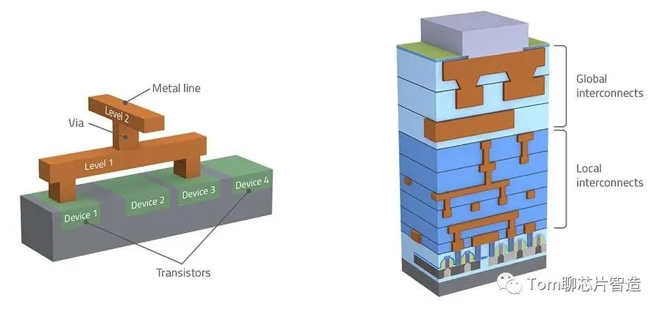 芯片互连指的是集成电路上,不同的部件之间进行电连接的金属连接。这些导线使得芯片内部的成千上万乃至上亿的晶体管之间可以进行信号传输。简单来说,就像几个水库,相互独立。通过挖沟渠的方式,将水库之间导通,来实现水流(电流)的流动。如果没有互连,芯片内部就像一个断路。