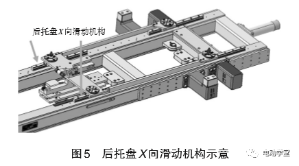 d.在后桥托板区域增加X向滑动机构,使后桥托板具备调整轴距的功能(图5)。