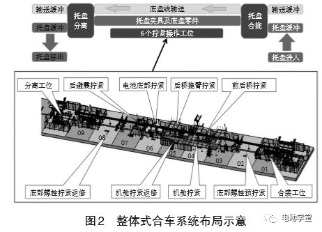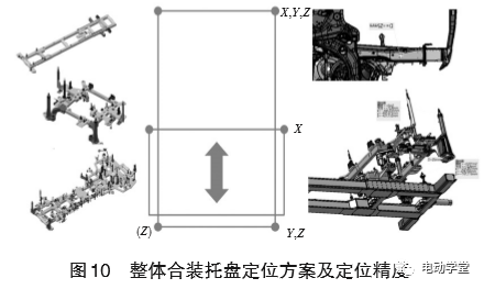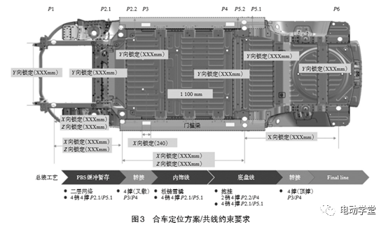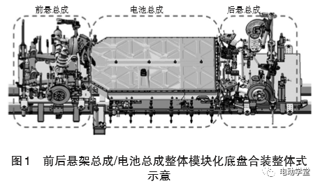 如图2所示,底盘模块装配理念是动力总成、电池总成和所有底盘零件全部采用在定位夹具上销孔精确定位方式,并且在合装前完成全部的连接和紧固。