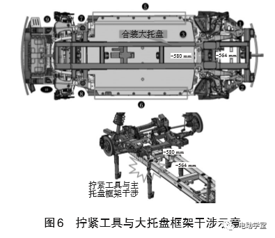 e.对于产品开发来说,标准托盘轨道宽度,可保证螺栓打紧点和敲紧点避开大托盘框架,从而减少工厂设备上的投资,同时减少生产过程成本。如图6所示,前期底盘模块开发过程中,一定要避免前后副车架/电池的安装点(1~10号安装点)的拧紧工具与大托盘框架产生干涉,这个是工艺硬点约束,需要底盘产品模块化设计之初做好预防。