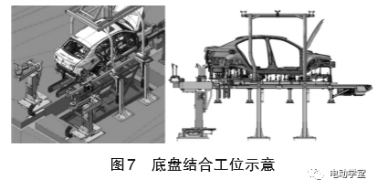 b.在带有合拢、分离举升功能、抬高的输送线上进行底盘安装,底盘安装过程中由托盘夹具带动车身吊架。