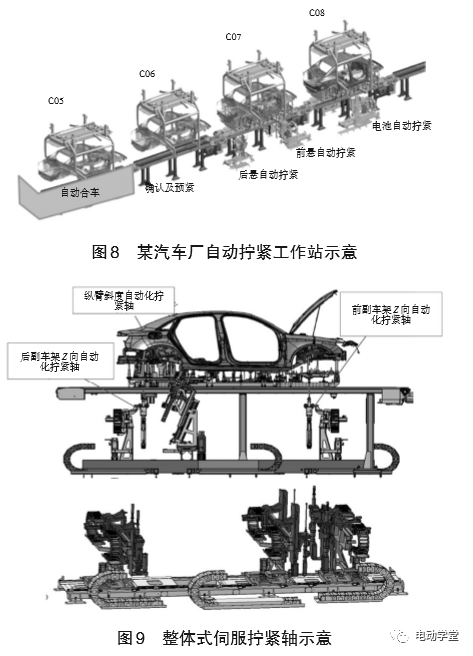 合车站完成车身与底盘结合,后进入拧紧的部分。车身底部规划为底盘螺栓自动拧紧设备,由侍服电机驱动拧紧轴在X/Y/Z各方向自动运行达到螺栓点或者托板上的螺栓连接杆进行自动打紧,参考图8所示。如图9所示,底盘螺栓自动化拧紧设计方案中,主要对前副车架、电池总成、后副车架的紧固点进行自动化拧紧,即Z向的紧固点适合采用自动化拧紧,其余的紧固点保留人工拧紧方式。