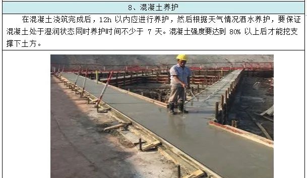 1、原材料进场应重点检查钢筋外观质量、材料出厂质量证明书、复检报告, 确保无误并验收合格后方可使用;2、钢筋的规范、数量、品种、型号均应符合图纸要求,绑扎成形的钢筋骨架不得超出规范规定的允许偏差范围;3、重点检查钢筋半成品质量和绑扎质量,主要包括钢筋规格、形状、尺寸、数量、间距;钢筋的锚固长度、接头位置、弯钩朝向;焊接质量;预留洞孔及埋件规格、数量、尺寸、位置;钢筋位移;钢筋保护层厚度及绑扎质量;4、设专人看护,严禁踩踏和污染成品,浇筑混凝土时设专人看护和修整钢筋,焊接前配备监护人员和灭火设备。1、模板重复使用时应编号定位,清理干净模板上污渍并刷隔离剂,使混凝土达到不掉角,不脱皮,表面光洁;2、处理好冠(腰)梁与支撑梁、支撑梁与支撑柱交接处的模板拼装,确保支撑稳固度、刚度、垂直度、平整度和接缝,做到稳定、牢固、不漏浆;3、施工前检查上道工序质量,钢筋位置及放线位置是否正确;及时更换有缺陷的模板,并予以修复,加强工序自检,加强出场管理及现场保养;连结件扣紧不松动;支撑点牢固可靠,损坏模板背楞不予使用。1、浇捣使用插入式振动棒,振动器的操作要做到“快插慢拔”,振动距离应小于振动棒作用半径的 1.5 倍,振动上层砼时,振动棒插入下层 50mm,不得漏振,每一点振捣时间为 20~30S。2、混凝土达到 C12 之前人员不可站上内支撑,达到 80%强度之前不可开挖下层土方,达到 100%之前不得走大型机械。