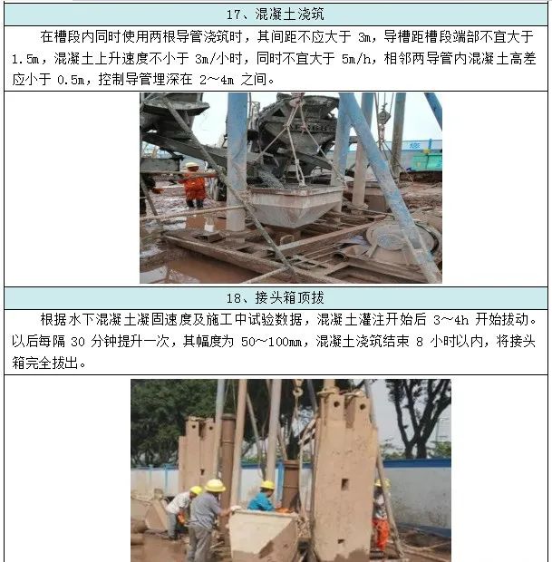 1、挖槽宜相隔 1~2 段跳段进行,从成槽至混凝土浇筑完成的累计槽壁暴露时间不宜超过 24 小时。2、挖槽时加强观测,如槽壁发生较严重的局部坍塌时,应及时回填并妥善处理。3、挖槽结束后,及时检查槽位、槽深、槽宽及槽壁垂直度等,合格后方可进行清槽换浆。4、槽段长度允许偏差 2%;槽段厚度允许偏差+1.5%,-1%;槽段倾斜度允许偏差 1/150;墙面局部突出不应大于 100mm;墙面上的预埋件位置偏差不应大于100mm。5、承重墙槽底沉渣厚度不应大于 100mm,非承重墙槽底沉渣厚度不应大于150mm。1、单元槽段钢筋笼装配成一个整体,钢筋笼必须分段时,采用搭接接头, 接头位置和长度应满足混凝土结构设计规范的要求。2、起吊过程中保证钢筋的保护层厚度和钢筋笼有足够的刚度,采用保护层垫块、纵向钢筋桁架及主筋平面的斜向拉条等措施。3、钢筋笼的钢筋交叉点至少 50%采用焊接,焊接点必须牢固,临时铅丝绑扎点在钢筋入槽前应全部清除。4、钢筋笼平稳入槽就位,如遇到障碍应及时重新吊起,查清原因,修好槽壁后再就位,不得采用冲击、压沉等方法强行入槽,钢筋笼就位后应在 4 小时内浇筑混凝土,超过 4 小时未能浇筑混凝土,把钢筋笼吊起,冲洗干净后再重新入槽。5、钢筋笼的下端与槽底之间宜留有 500mm 间隙,钢筋笼两侧的端部与接头管或相邻墙段混凝土接头面之间应留有 100mm~150mm 的间隙。1、单元槽段内同时使用两根导管浇筑时,其间距不大于 3m,导槽距槽段端部不大于 1.5m,各导管底面的高差不大于 0.3m,施工中采取措施避免混凝土绕过接头管注入另一个槽段,混凝土连续快速浇筑,并在初凝前结束浇筑作业,槽段过深时宜加缓凝剂。2、墙段之间的接缝选用圆形接头管或工字钢接头,换浆前接头面严格清刷, 不得留有夹泥或混凝土浮渣粘着物,浇筑混凝土时经常转动接头管,拔管时不得损坏接头处混凝土。3、墙段的浇筑标高应比墙顶设计标高增加 500mm。地下连续墙采用声波透射法进行墙身完整性检测,以判定墙身缺陷的位置、范围和程度。1、建筑基坑支护技术规程(JGJ120-2012)①地下连续墙检测墙段实量不宜少于同条件下总墙段数的 20%,且不得少于3 幅,每隔检测墙段的预埋超声波管数不应少于 4 个,且宜布置在墙身截面的四边中点处。②当根据声波透射法判定的墙身质量不合格时,应采用钻芯法进行验证。2、广东省建筑地基基础检测规范(DBJ-15-60-2008)地下连续墙作为永久结构的一部分时,抽检数量不应少于总槽段数的 20%, 当作为临时性结构时,抽检数量不应少于总槽段数的 10%,且均不得少于 3 个槽段。地下连续墙单个直槽段中的声测管埋设数量不用少于 4 根,声测管间距不宜大于 1.5m;对于转角槽段,声测管埋设数量不少于 3 根。声测管应沿钢筋笼内侧布置,边管宜靠近槽边,并沿基坑顺时针旋转方向对声测管依次编号。声测管顶部宜和主筋平齐或略低,以免开挖时受到损坏。埋设完后在声测管上部应立即加盖或堵头,以免异物入内
