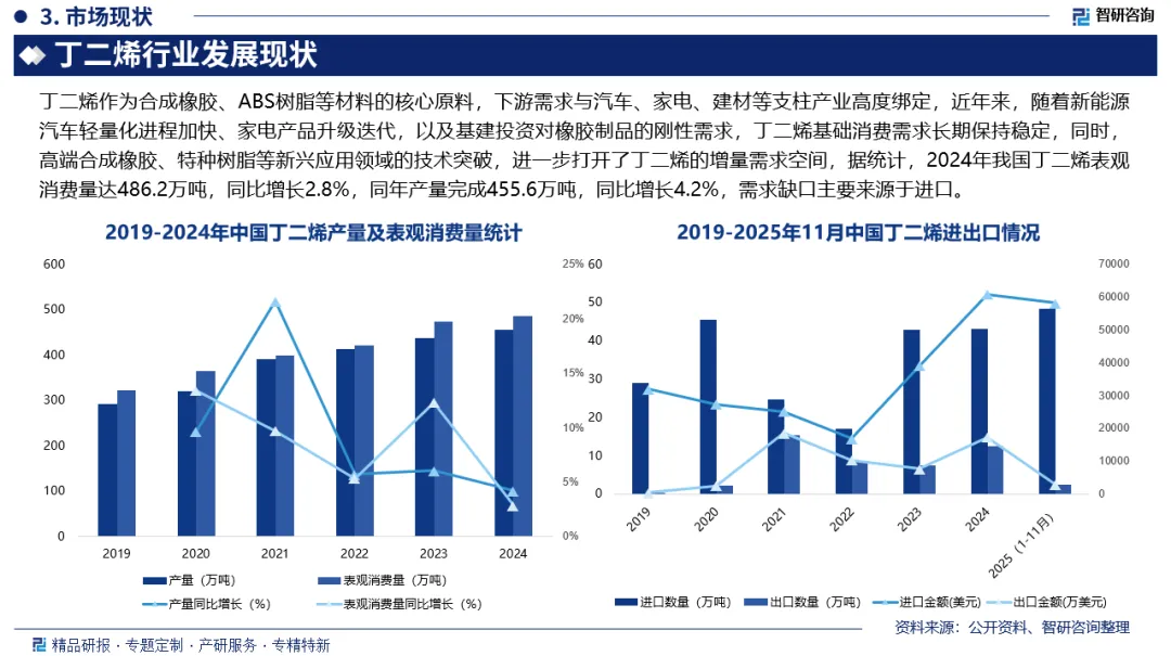 表观消费量:丁二烯作为合成橡胶、ABS树脂等材料的核心原料,下游需求与汽车、家电、建材等支柱产业高度绑定,近年来,随着新能源汽车轻量化进程加快、家电产品升级迭代,以及基建投资对橡胶制品的刚性需求,丁二烯基础消费需求长期保持稳定,同时,高端合成橡胶、特种树脂等新兴应用领域的技术突破,进一步打开了丁二烯的增量需求空间,据统计,2024年我国丁二烯表观消费量达486.2万吨,同比增长2.8%,同年产量完成455.6万吨,同比增长4.2%,需求缺口主要来源于进口。