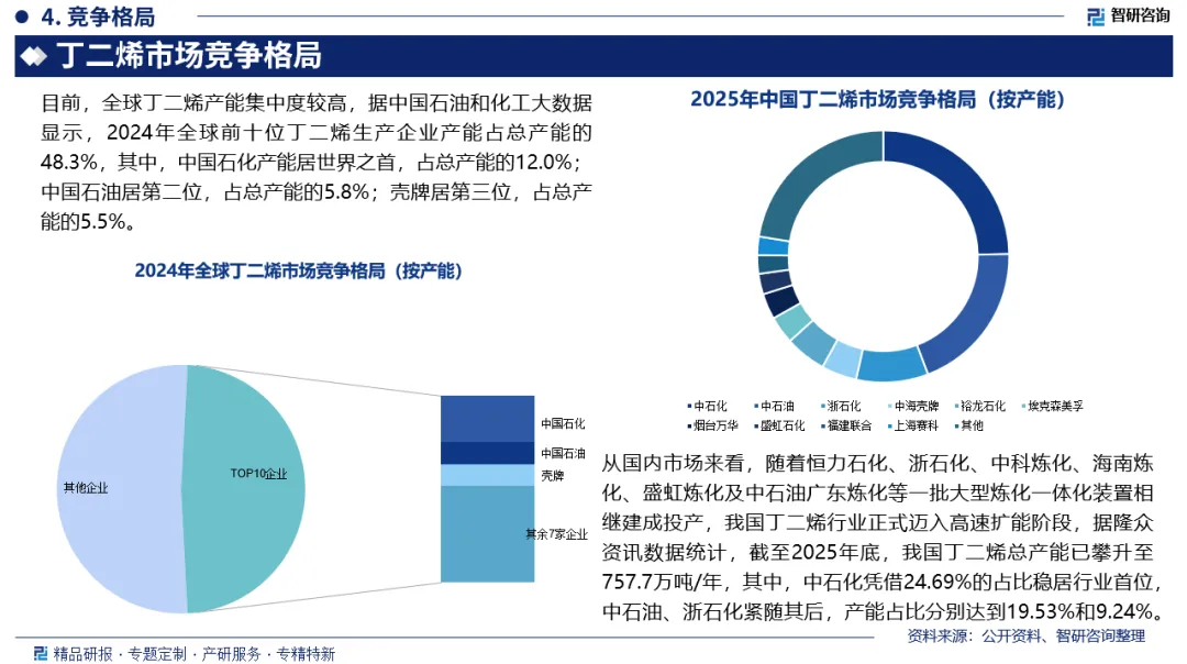 市场竞争格局:目前,全球丁二烯产能集中度较高,据中国石油和化工大数据显示,2024年全球前十位丁二烯生产企业产能占总产能的48.3%,其中,中国石化产能居世界之首,占总产能的12.0%;中国石油居第二位,占总产能的5.8%;壳牌居第三位,占总产能的5.5%。