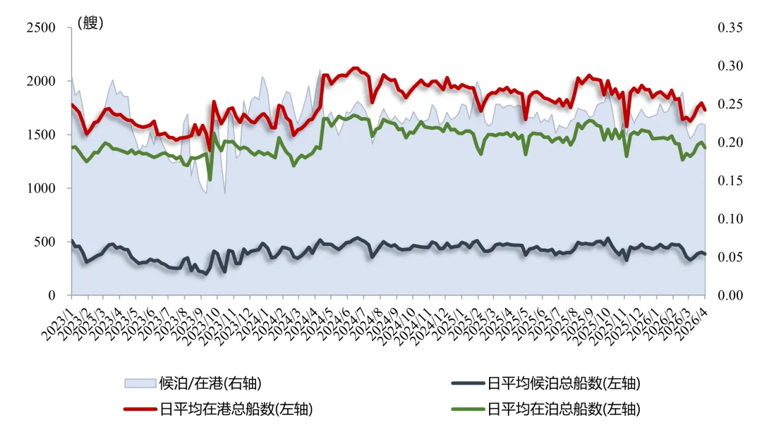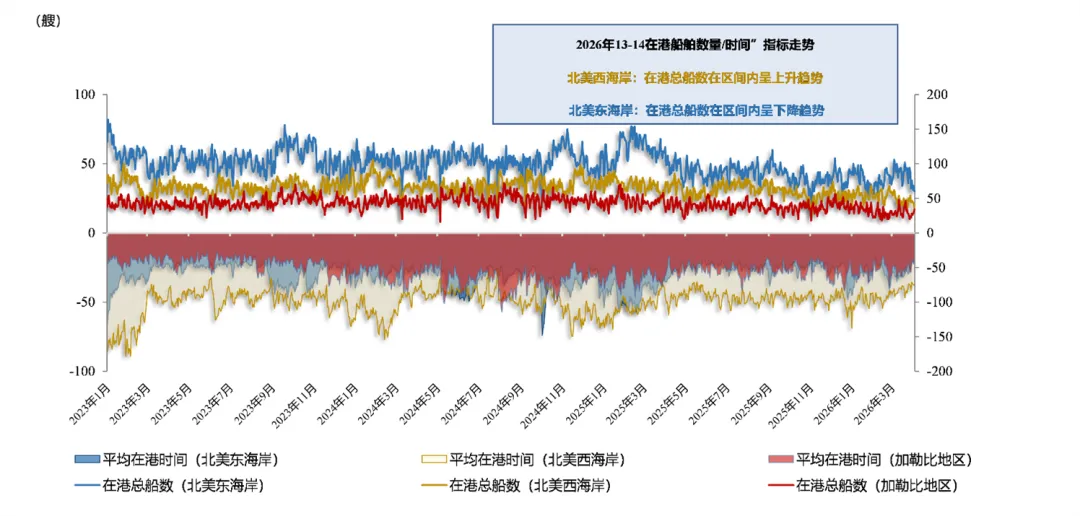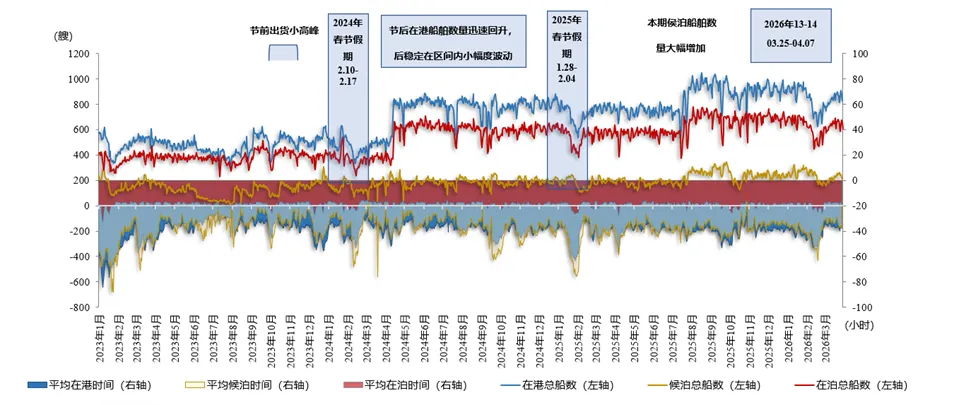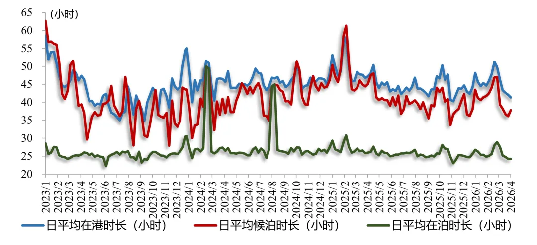 图表1:全球主要集装箱港口日均在港/候泊/在泊船舶数量走势图表2:全球主要集装箱港口船舶日均在港/候泊/在泊时间走势注:因“日平均候泊时长”中直接靠泊的船舶不参与计算,因此图中会出现“日平均候泊时长”大于“日平均在港时长”的情况,特此说明。1、中国大陆港口日均在港/侯泊/在泊船舶数量/时间均呈上升趋势。2026年3月,中国制造业PMI为50.4%,较上月回升1.4个百分点,制造业景气程度改善明显。这一回升既受季节因素影响,也反映出两会后各方对中国经济的信心增强。此外,美伊冲突背景下海外市场的补库存需求,对我国出口形成了一定利好。中国大陆主要港口(不含中国台湾、中国香港的共27个港口)的日均在港/候泊/在泊船舶数量较上期环比增速分别7.3%/21.8%/4.1%,日均在港/候泊/在泊时间较上期环比增速分别6.3%/7.2%/1.5%。霍尔木兹海峡封锁导致大量航线改道好望角,原分散到港的船舶于3月底至4月初集中抵港,候泊船舶数量激增。尽管宁波舟山港、青岛港等效率持续提升,但到港激增远超消化能力,推高了各项时间指标。图表3:2023年1月1日-2026年4月7日中国大陆港口船舶在港时间表现走势2、北美日均在港船舶数量大幅减少,日均在港/候泊/在泊时间均呈下降趋势。