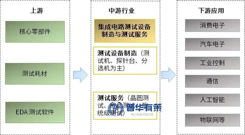 集成电路测试行业产业链完整协同,中游设备制造与测试服务为核心;上游核心零部件、耗材、EDA软件技术壁垒高,高端环节仍被海外主导,国内企业正加速突破;中游测试机、探针台、分选机国产替代提速,第三方专业测试依托分工优势快速崛起;下游以消费电子、汽车电子为主,多领域应用需求推动行业向高端化、多元化发展。