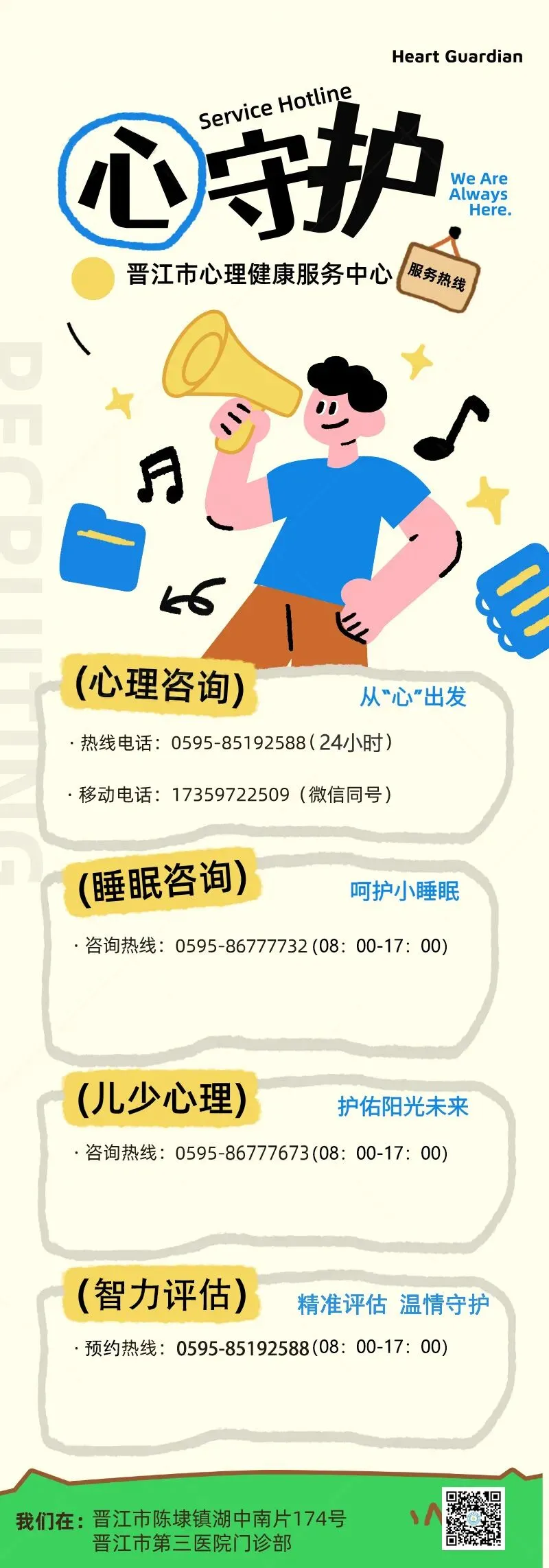 晋江市第三医院(晋江市心理健康服务中心)始建于1958年,是晋江地区唯一一家集预防、治疗、康复、教学、科研于一体的公立心理健康专科医院,目前为国家精神心理疾病临床医学研究中心联盟成员单位(设有湘雅名医工作室)、晋江市精神(心理)疾病防治指导中心、晋江市心理危机干预队挂靠单位、泉州师范学院博士工作室及硕士研究生培养基地。我们将不断提升医疗服务质量,完善就诊服务流程,努力把医院建设成为群众满意、放心的医院,构筑心理健康发展新高地。