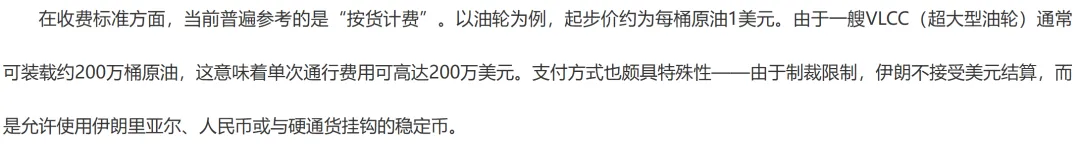 最近,伊朗对通行霍尔木兹海峡的油轮开征"过路费"。那我们沿着这个方向看看,会产生哪些影响。霍尔木兹海峡多重要,不用多说,就全球市场的表现,不关注的人都知道海峡的重要性了。所以只简单放两个基本信息:根据美国能源信息署(EIA),2024年,通过霍尔木兹海峡的石油流量平均为每天2000万桶,相当于全球石油消耗量的约20%。海峡最窄处仅约21海里(39公里),伊朗一侧有格什姆岛、霍尔木兹岛等天然要塞,军事上易守难攻。伊朗也并非第一次拿霍尔木兹做文章,早在2012年、2019年,伊朗都曾威胁封锁该海峡。但封锁是核弹级选项,国际代价极高,退而求其次的选择就是有节制的收通行费——既不触发全面军事反应,又能直接变现地缘优势,或者说地缘威胁。结果这次美国打了一个月,直接让伊朗收成功了。1.货运费:按船舶载重/载货量一次性收费,是伊朗最理想的收费形式,但是几乎没有实现的可能。货运费类似于吨位税,我国施行已久,哈尔克岛也施行已久,都属于入港费用这种层面。而通过霍尔木兹海峡的大多都是超大吨位VLCC,因此实际收费标准会完全不一样。目前已经公布的收费标准是1美元/桶石油,不接受美元或欧元结算。按照1美元算,一艘VLCC大概收200~300万美元,而且只有美以相关国家的船只收这么多。这个价格转嫁到船上的原油上也就1块过一点的涨幅,再往全球市场传递造成的影响也会更有限——毕竟收钱比直接不让过好的多。所以短期内各国都能接受,对战争结束的期望要比不收的期望大很多。如果伊朗长期收费,大概率也是持续这种每桶石油收费。但货运不止石油,所以其次还可能对油轮外的其它船只按吨位或者货物价值收通行费。此外,分级收费也一定会普及,这是重要的外交方案,给予友好国家低价通行权限,而美以为代表的国家可能进一步上浮。长此以往,对全球能源和外交的影响或许远超近期海峡封闭造成的影响。2.安保费:以保障波斯湾航行安全为由收费,处于国际约定的灰色地带,也是伊朗目前正在施行的措施。现在伊朗执行的“友好度分级+差异化计价”按照他们自己的说法就是安保费,因为货运费的形式目前无法得到国际承认。国际上的《联合国海洋法公约》明确禁止阻碍船只通过霍尔木兹海峡的行为,因为其属于"用于国际航行的海峡",所有国家船舶享有过境通行权(无阻碍地通过)。因此伊朗用“美以长期威胁海峡船只通过安全”、“收取多年来运营海峡的损失”为由将货运费改为安保费。但这个说法长期肯定站不住脚的,所以推进国际承认第一点所说的“货运费”是短期内伊朗非常重要的政治任务,但非常艰难。从这一点讲,美国提出的“和伊朗一起收费”根本没有任何可能性。首先美国自己都没有承认《联合国海洋法公约》,其次全球主要航运国、石油进口国也绝不可能同意把免费过境海峡改成收费通道—— 一旦开这个先例,马六甲、直布罗陀、曼德海峡都会跟风收费,全球航运和能源成本会彻底失控。所以完全不用担心发生“前一天两国打得不可开交,后天一起拦路收钱”的魔幻现实,老特头的梦是不可能实现的。从国际能源局势来讲,伊朗在霍尔木兹海峡收通行费得到承认都是非常困难的一件事,短期甚至中期都将以“安保费”的灰色形式存在,何况再加上一个美国。总而言之,波斯湾是伊朗的家门口,而全球约20%的石油必须从这里的海峡经过。所以只要不是零概率事件,市场就需要为这个风险定价,何况这地儿一直以来都是有火药桶的属性的。按照差异化收费估计,首先美日韩+欧洲这种全资过海峡的能提供极其丰厚的过关费用,其次是友好国家比如我国,按照我们的能源体量就算少交很多累计下来也不少。按照历史数据,霍尔木兹海峡日均通行船只约100艘,其中60%为运油船(下图墨绿色的部分)。图中的Tanker是包含两种油的,分别是Clean和Dirty类型的,差别挺大,但下面是估算,不考虑区别:每天两千万桶石油,一桶一美元;剩下的船一艘10万美金,平均每天40艘;再加上5%的豁免和25%的半价优惠。这么算下来一年能有多少钱?(2000×1+40×10)×(0.7+0.25×0.5)×365当然国际上不支持的声音肯定是大多数,那再打个折按照60亿美元来算。根据世界银行统计,2024年伊朗国内生产总值约4369亿美元,人均国内生产总值4771美元;2025年据说是4752美元,这60亿美元的收入能占到GDP的1%往上。收来的钱强制以伊朗里亚尔或人民币结算,要么大幅填补国内财政缺口,要么大幅增加外汇储备,都是好事,但长期来看问题还是很大。一方面,国际制裁或许会非常严峻。伊朗十分以来能源、化工与矿产的出口,如果欧美等国家联合制裁,施行包括提高关税、冻结资产、限制油运等一系列措施,将对伊朗的经济造成致命打击。另一方面,海峡周边不只有伊朗。沙特等国花费几年时间开辟新的输运路线,将对霍尔木兹海峡航运量造成直接影响,进一步挤压伊朗用海峡作为筹码谈判的空间。所以,虽然目前看伊朗占据了很大的优势,全球都拿他没有办法,懂王还爆了粗口。但是中长期看,伊朗已经步入了一个非常危险的境地,前有悬崖,后有狼群——海峡牌的保质期有限,国内经济又经不起进一步的摧残,面对制裁没有有效的反击手段,所以肯定是没法长期收费的。伊朗本身定然也是清楚这一点的,所以在谈判桌上面对天大的压力才做到了一点都不松口,不趁着这次战争打出的气势为以后铺